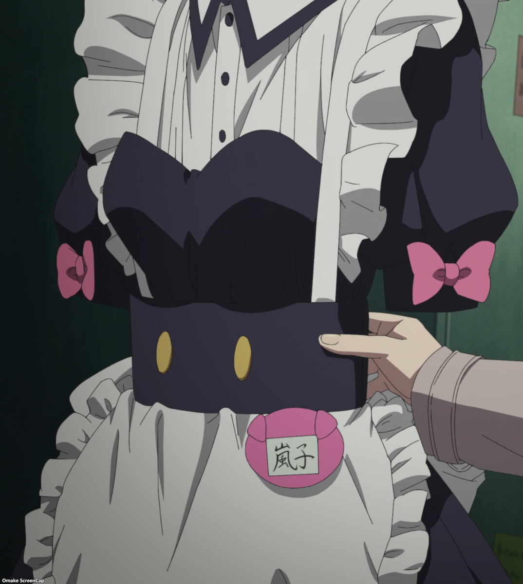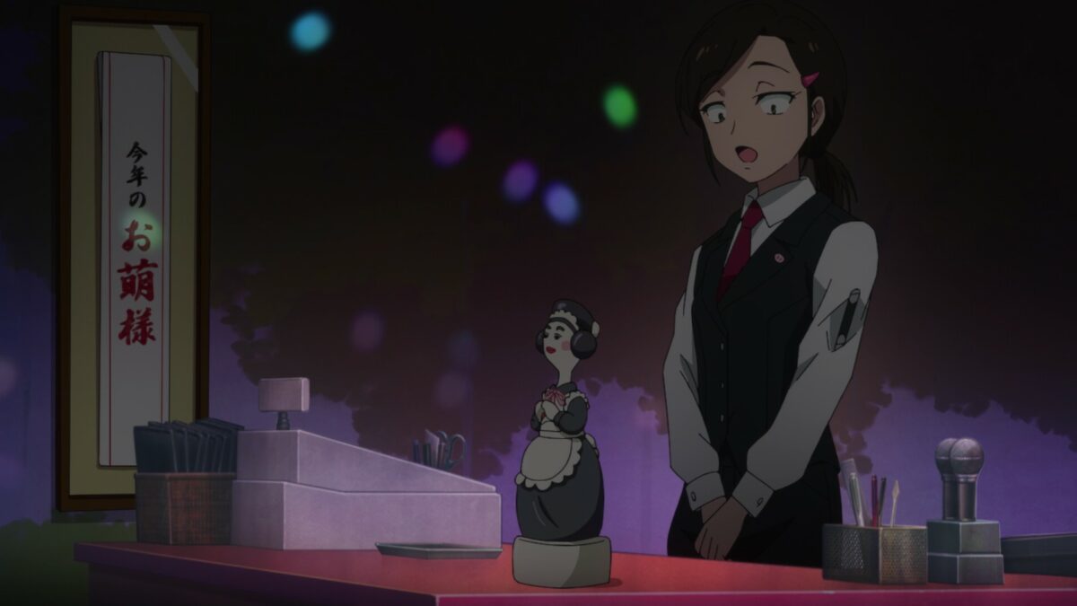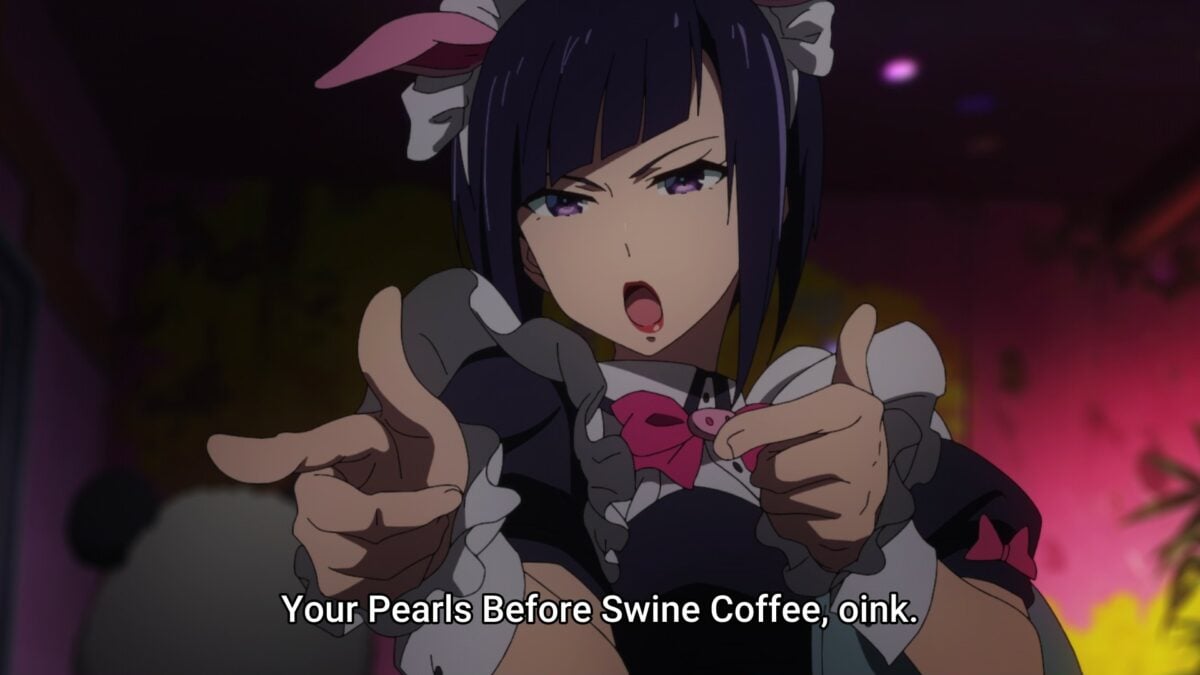 Ooh. Look how busy the Oinky Doink Café is! The Lady Omoe prize, which Nagomi won in the last Akiba Maid War episode, comes with benefits. The café also gets a cute statue! Har. A swine-themed café would have a menu item named after a swine-based saying. How would “Pearls Before Swine Coffee” taste? Ooh, flirting about pearls with Mr. Turtleneck. Nagomi reminds the other maids that they’re not supposed to have relationships with customers! Huh. The maid mafia has strict rules and harsh punishments. We’ve heard about cafés losing their group affiliation, then other maid cafés violently crushing them. But those disaffiliation consequences apply to individual maids too. Lots of foreshadowing for star-crossed lovers of maids.