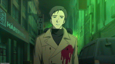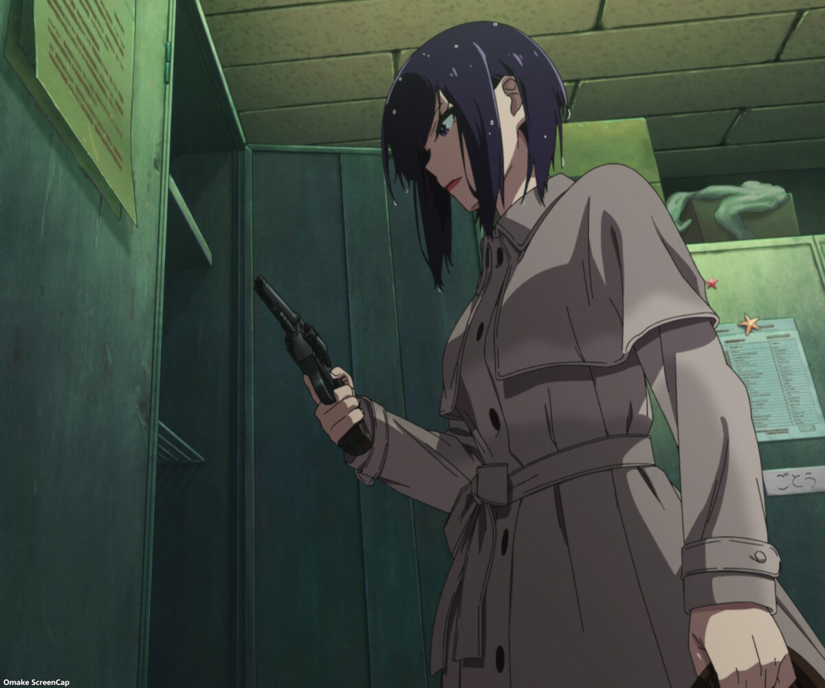 Ha! I knew it! Ranko couldn’t kill Okachimachi. The panda maid wears pig ears too! Suehiro bought something at a jewelry store. Squee! Will he propose to Ranko? Aw. Nagomi feels sad that Ranko is leaving her. She calls leaving the maid café for marriage “graduation.” Oh, come on, Akiba Maid War. I hate this shifty narrative device of showing scenes with context knocked out. The rain falls on Ranko, which gives us the second part of the episode title. Uh oh! Okachimachi shot Suehiro! Ranko won’t get her happily ever after ending now. Suehiro has long enough to smoke a cigarette and spill his guts about his orders.