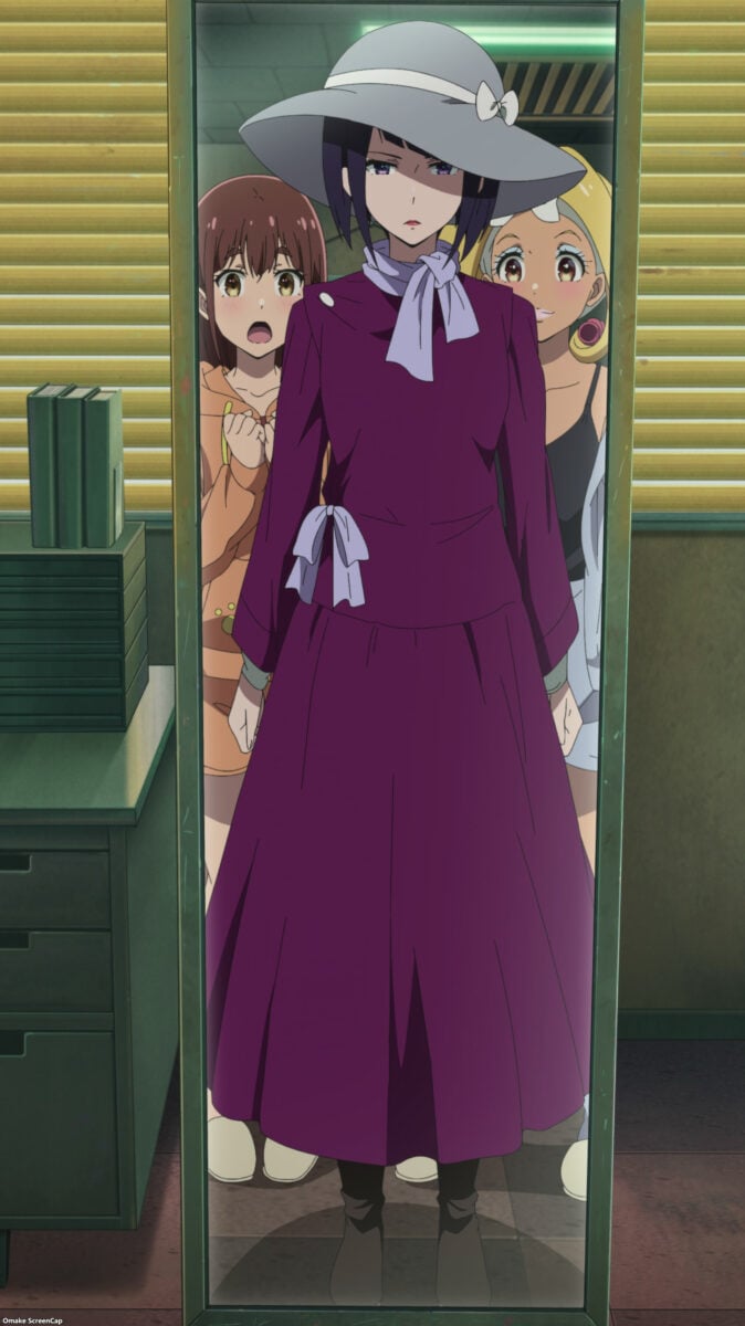 Ah. Mr. Black Turtleneck has a name. Mr. Suehiro. Does that mean we won’t have to remember his name by the next Akiba Maid War episode? Eeeh! Maids can’t date their customers! Of course. The bringer of bad luck instantly agreed for Ranko, then set an appointed time. Tenchou thinks Suehiro is a banker because he carries a metal attaché case. Does she not remember what town she works in? His fashion choices scream “hitman.” Ack. I thought Mr. Turtleneck was in the panda costume! I was wrong. So, who’s in there?