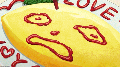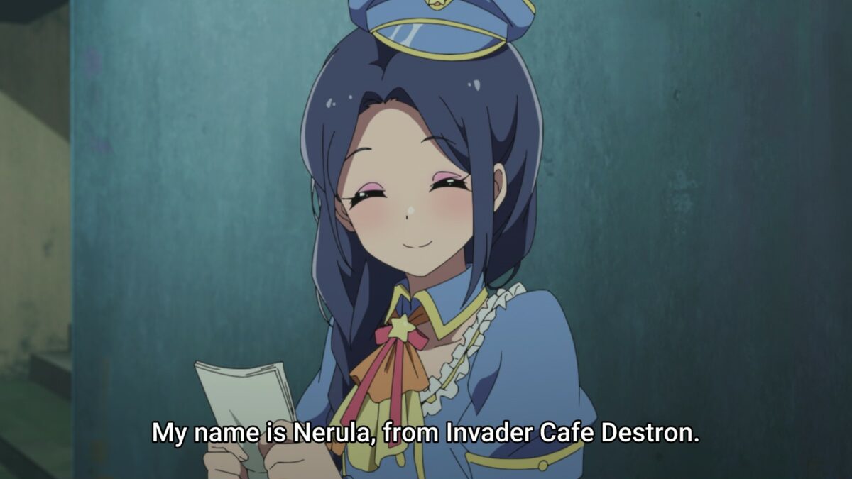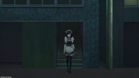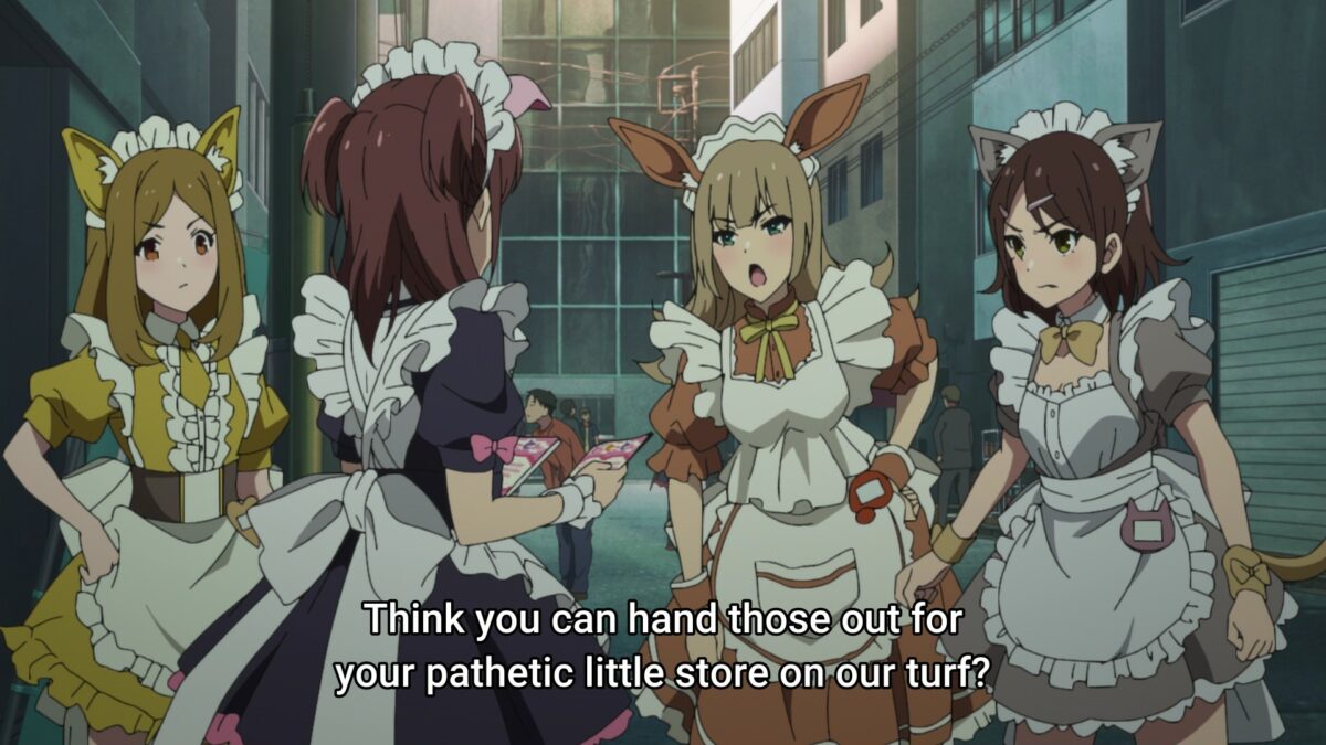 Nagomi does not understand yet. Business as usual includes shooting up another maid café! Aw, poor Nagomi. She’s traumatized from all the blood she saw last night. Ketchup writing on omelet rice will be a trigger in Akiba Maid War. Mixing strawberries are also traumatic. We’re learning a lot about café maid terminology. Going for “a walk” means “passing out flyers.” Guh. There’re turf wars over where maids stand to hand out pieces of paper. Oh, don’t tug our heartstrings like that. Nagomi’s new friend will have a tragic end soon. Even Nerula knows how rough “skirmishes” can be. “Violence is part of the deal,” she says!