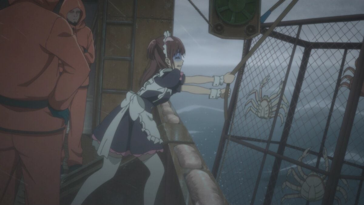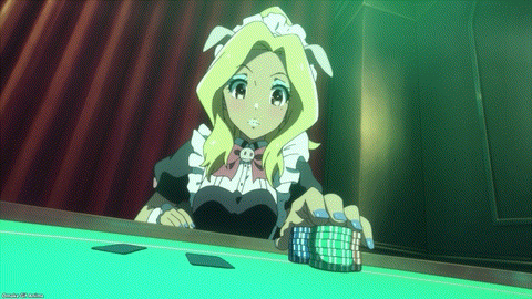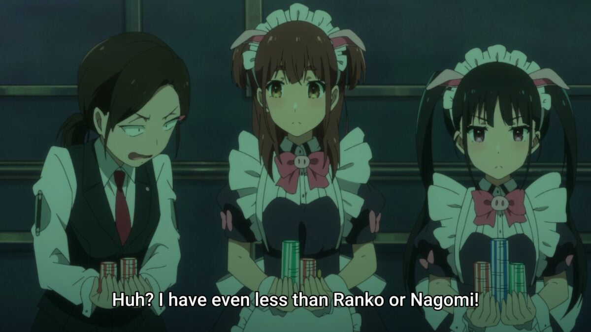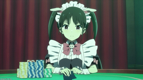 That went as well as we figured it would. Tenchou claims maids go crab fishing to pay off their debt. In maid uniforms! I doubt it. They might go catching crabs another way if you know what I mean… Yumechi thinks she has a chance to win. Darn you, Akiba Maid War, for giving us hope! Yumechi knows how to play and can follow tells and cheats. But she’s still at a disadvantage. The House knows what cards she has! And we’re caught up to the flashforward at the start of the episode. Yumechi went all in! Then she recounted how the dealer and her partner cheated. Ha. Hahaha! Her Full House 8s and Jacks lost to 9s! The hope is gone. Ranko, you’re up! We know what’s coming next.