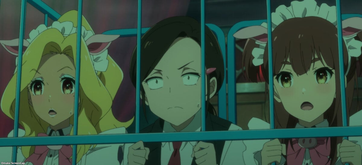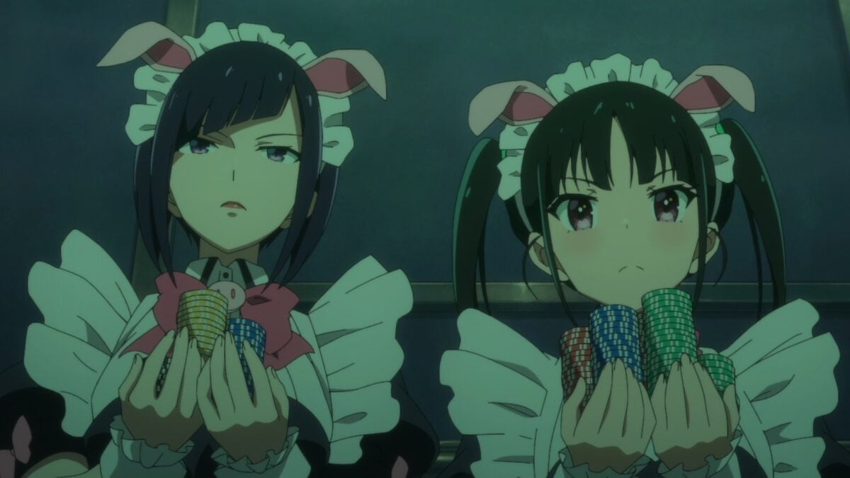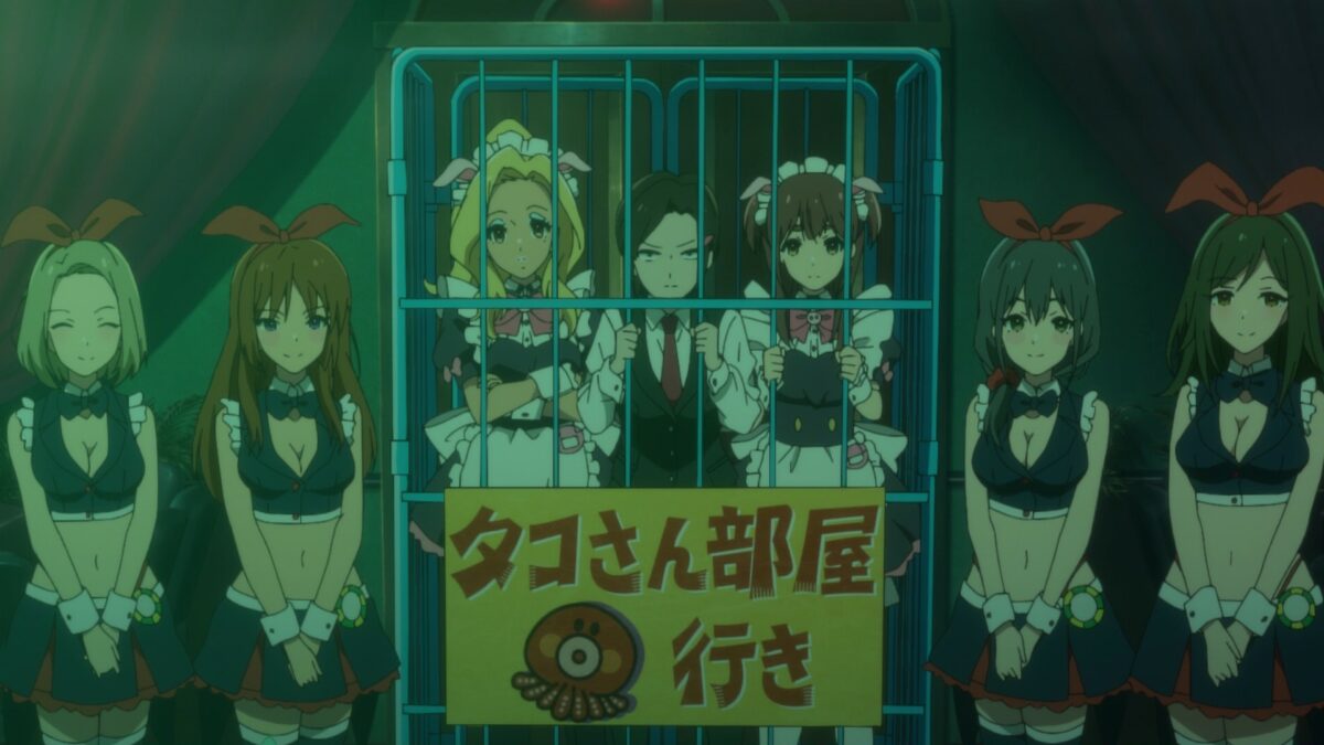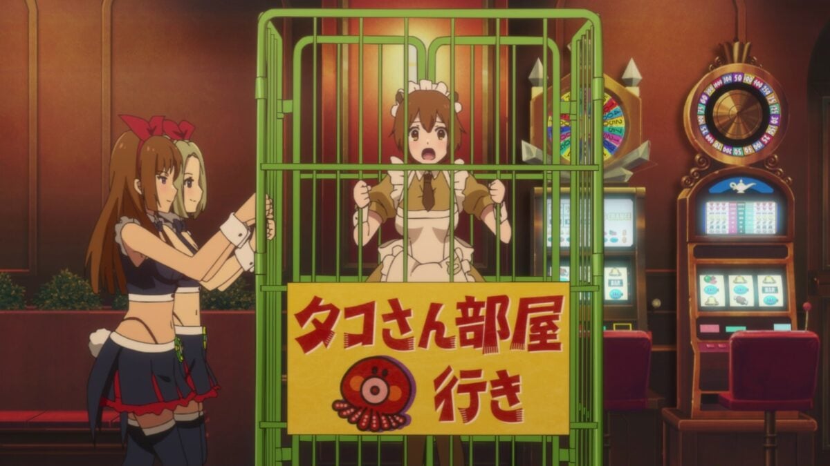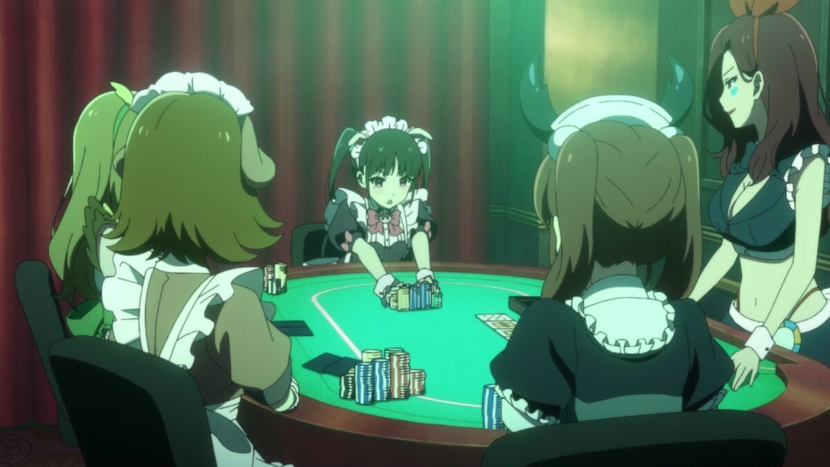 Ooh. Akiba Maid War has a maid casino! Yumechi is on the final call of Texas Hold ‘em. Her maid companions are in a cage! What is going on here? This is a flashforward, so we need to see how she got there.