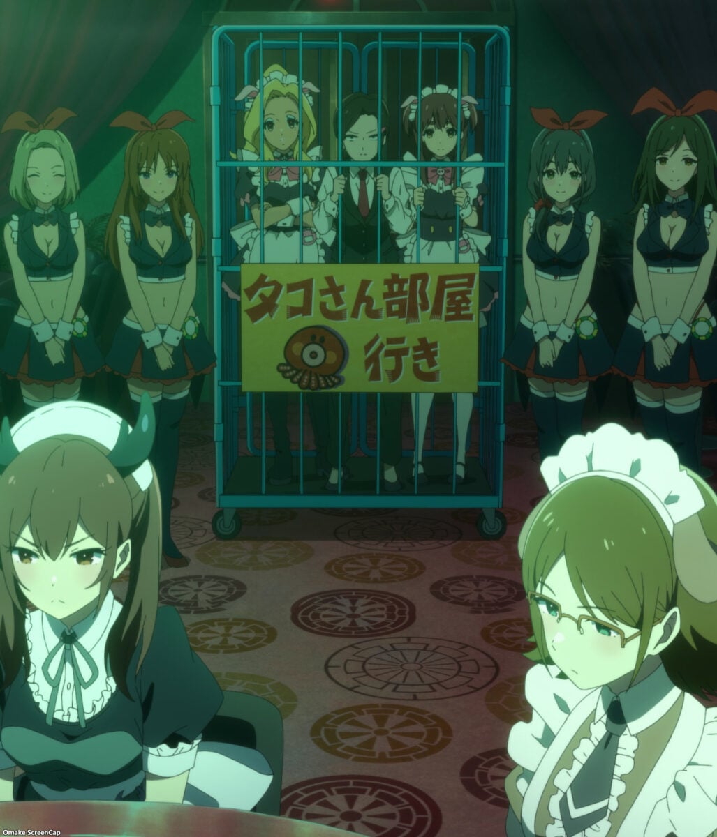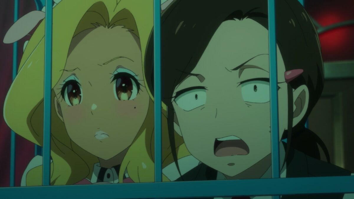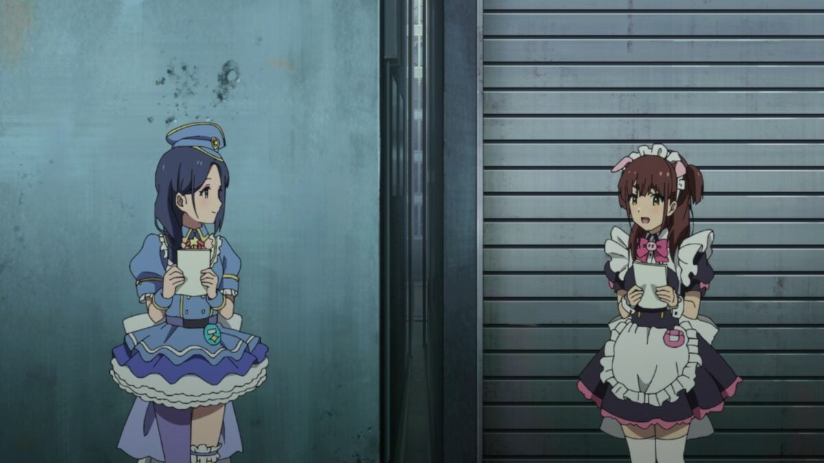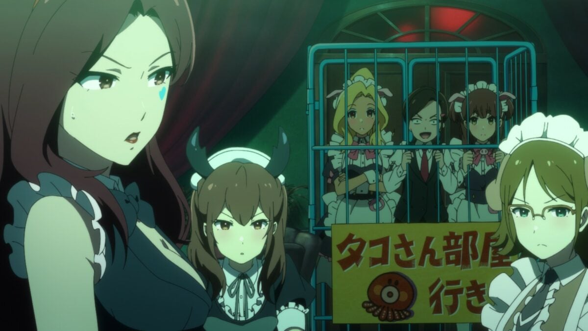 Ooh. Akiba Maid War has a maid casino! Yumechi is on the final call of Texas Hold ‘em. Her maid companions are in a cage! What is going on here? This is a flashforward, so we need to see how she got there.