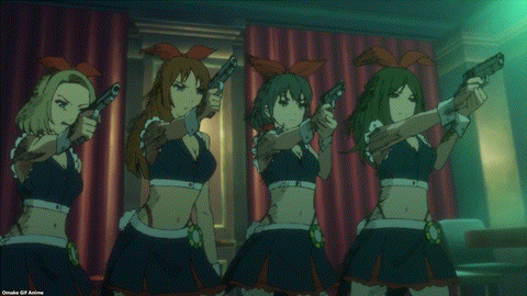 Blammo! Down goes another maid group in Akiba Maid War. Everybody has guns! Bring on the gangster drama horn music! Shiipon and Yumechi can handle pistols, but it’s been a while. Hoho! Panda Okachimachi sabotaged the kitchen. Things are about to get hot! Rambo Ranko returns Casino Maid’s grenade. With interest! Ooh, artsy thematic imagery of burning money.
