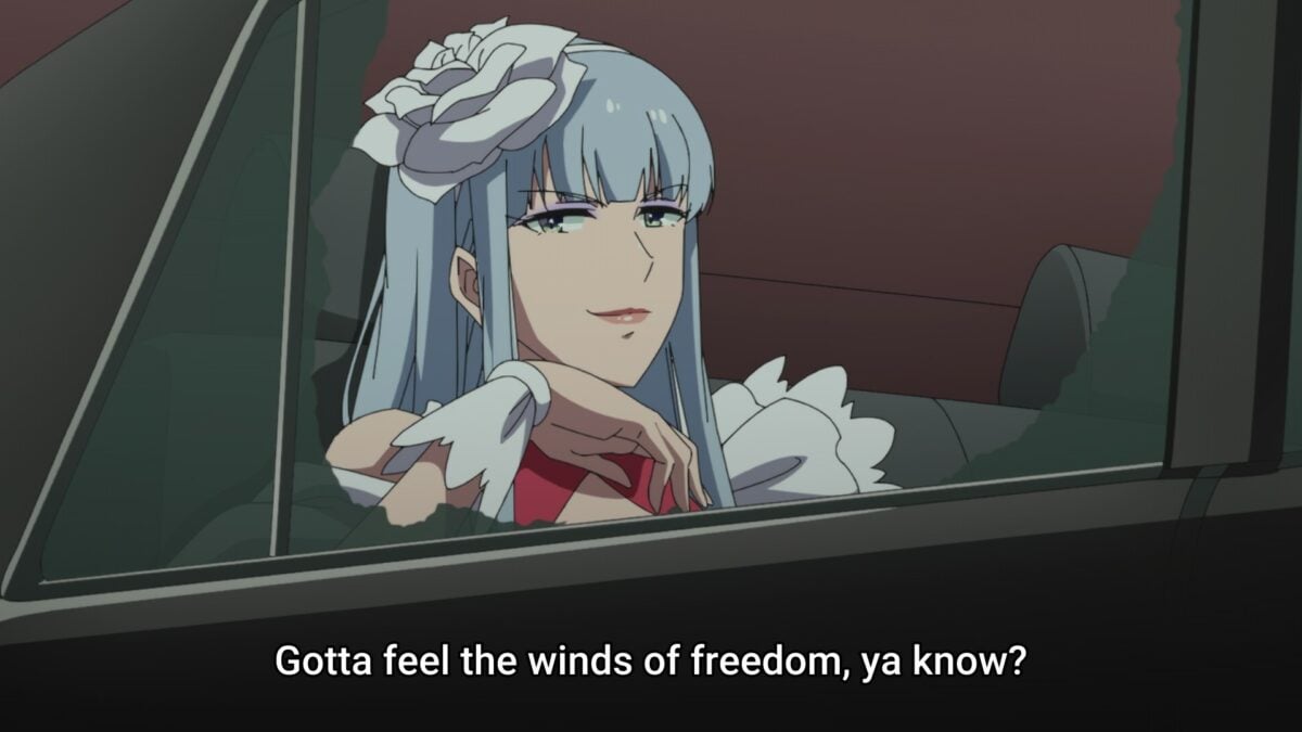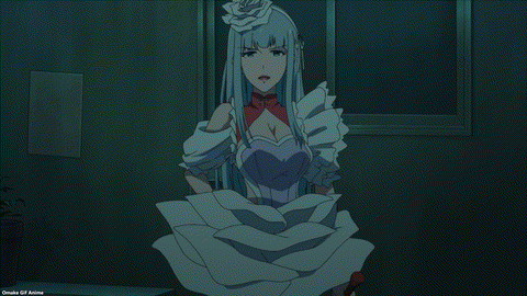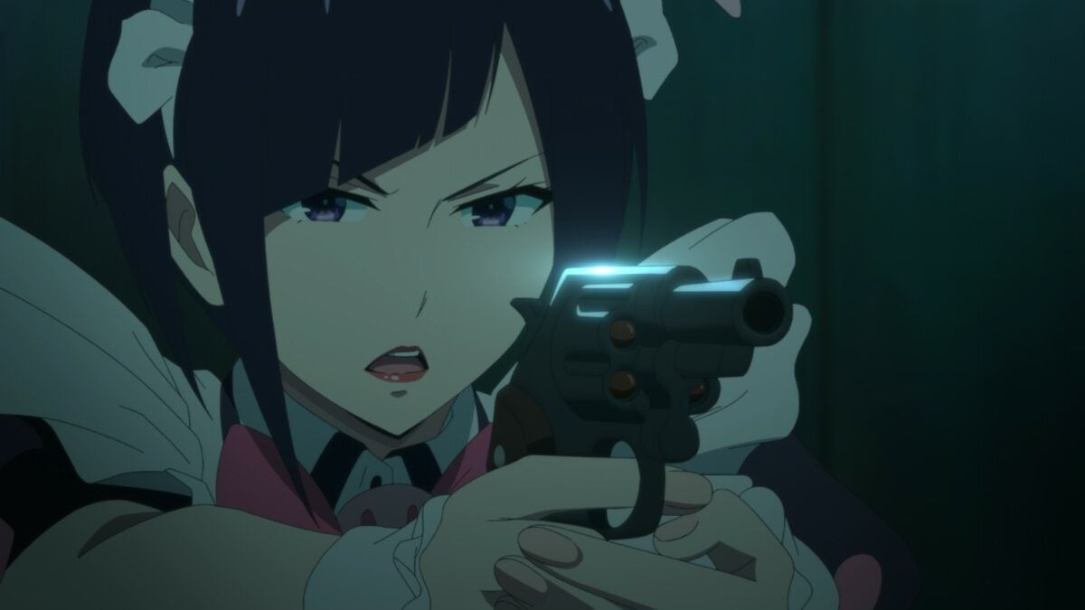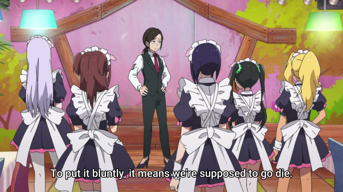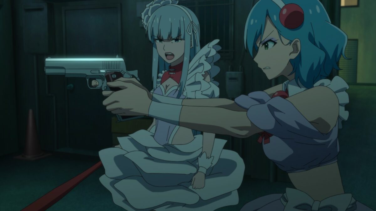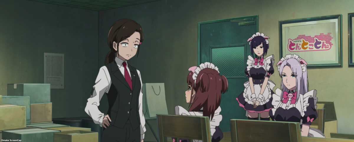 Ooh. Manami owns the red shoes in the Akiba Maid War opening credits. The old gang leader of the Maid Aliens died while she was in prison. The new one looks like she eats well from the profits of the maid cafés. Uh oh. Manami wants to know what happened to the Wuv-Wuv Moonbeam representative. We know that Ranko put a bullet through her forehead. The “old ways” meant that Oinky Doink’s manager needed retaliation. Welp. The new Maid Alien boss can’t stand up to the Crimson Supernova, so we can tell where this story is going.