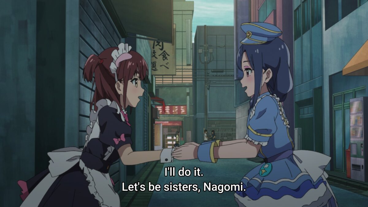 Ranko and Manami meet at the Dorama ramen shop. Original gangsters eating noodles together before the maid war in Akiba starts. Word travels fast around Akiba. The maids look at Nagomi, knowing she’s doomed. Oh no. How will Nerula and Nagomi’s friendship fare through the Maid Alien’s return to violence? The Oinky Doink girls discuss their options. The assassination of the Crimson Supernova is a tough ask, but how else can they stay alive? Tenchou knows more “old ways,” too. Becoming blood brothers in gangster movies is a tradition, so it makes sense Akiba Maid War has its version. Oho! Nagi was Ranko’s maid-sister! Nagomi is Ranko v2.0. I’m sure the death of the maid tea house manager was the catalyst for Ranko becoming Rambo.