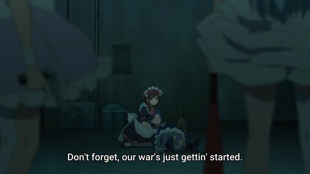 Oh, finally! Akiba Maid War shows us how the gang known as “Police” operate. They take protection money too. They don’t care what the maid gangs do if the public doesn’t see violent crime. Uh oh. Nerula is doing more than protecting Oinky Doink. Tipping off the police is a death sentence. Here it comes. Nerula’s death is the spark for an all-out gang war! Will Nagomi follow Nerula’s dying wish to stay a non-violent maid? Or will she follow the path of Ranko to protect others who fight for her?