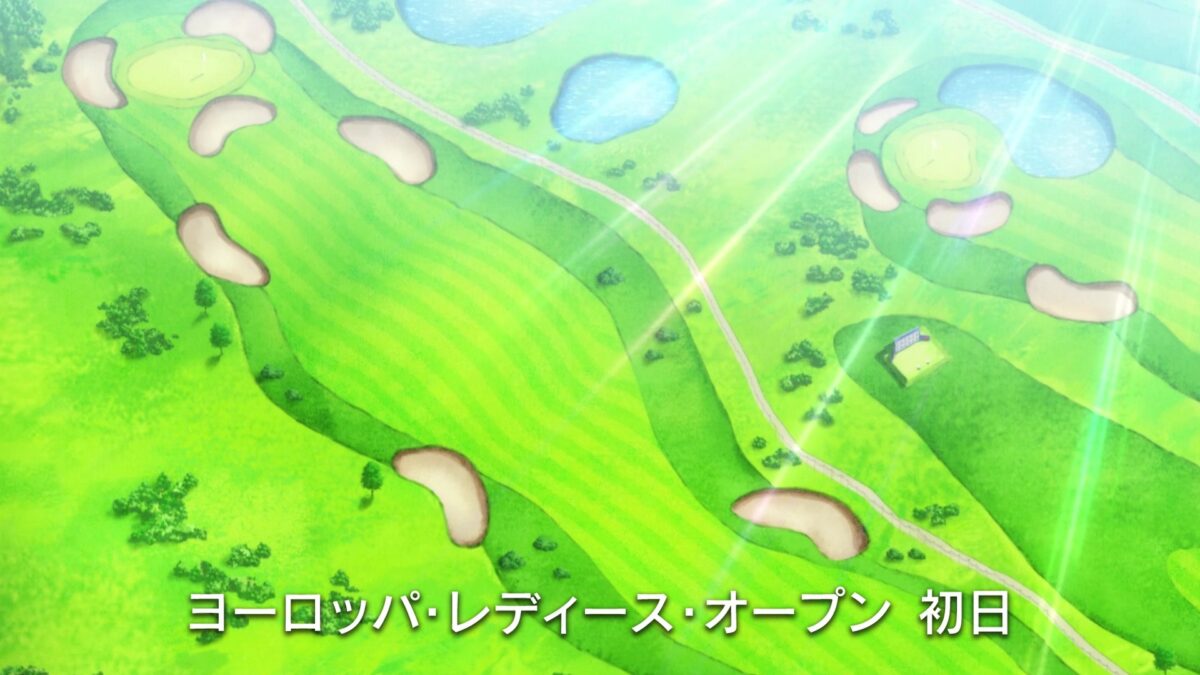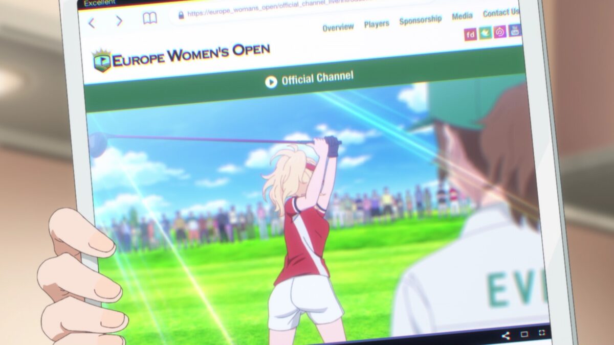 The distances on the course are just a bit out of reach for Eve’s shots. Her Indigo Bullet did not clear the water hazard. BIRDIE WING shows Eve testing herself against the conditions to collect information. This is only the first round of four, but she must make the cut after the second day. Aw. Aoi is a pro golfer now, but that means doing all the things Reika does too. Fashion shoots, product endorsements, and interviews. There’s even a Namco Classic! That’s nice, but I want more Gundam product placement from Bandai Namco. But she only wants to watch Eve play in (checks website) the Europe Women’s Open. Hey! That’s not what the Japanese katakana spelled out!