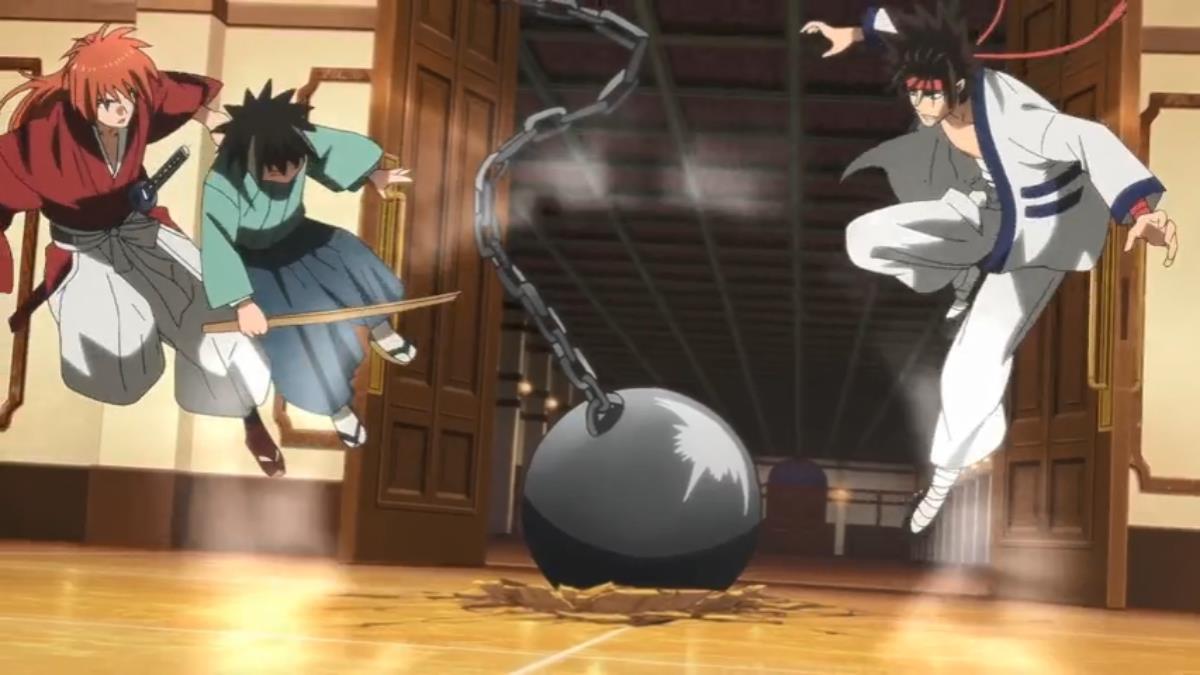Shikijo was already KO’d in the 1996 iteration, as we discussed before. The fight is a lot less even than it was back then. Shikijo seems to toss Sanosuke like a ragdoll, whereas in the past, Sanosuke could go toe to toe with him. Kenshin and Sanosuke meet up with Aoshi after Han’nya is defeated, and Aoshi KO’d Sanosuke in a single hit. That was then, and this is now. Sanoske’s fight with Shikijo happens inside the manor, and as before, he grabs the metal ball like a champ.