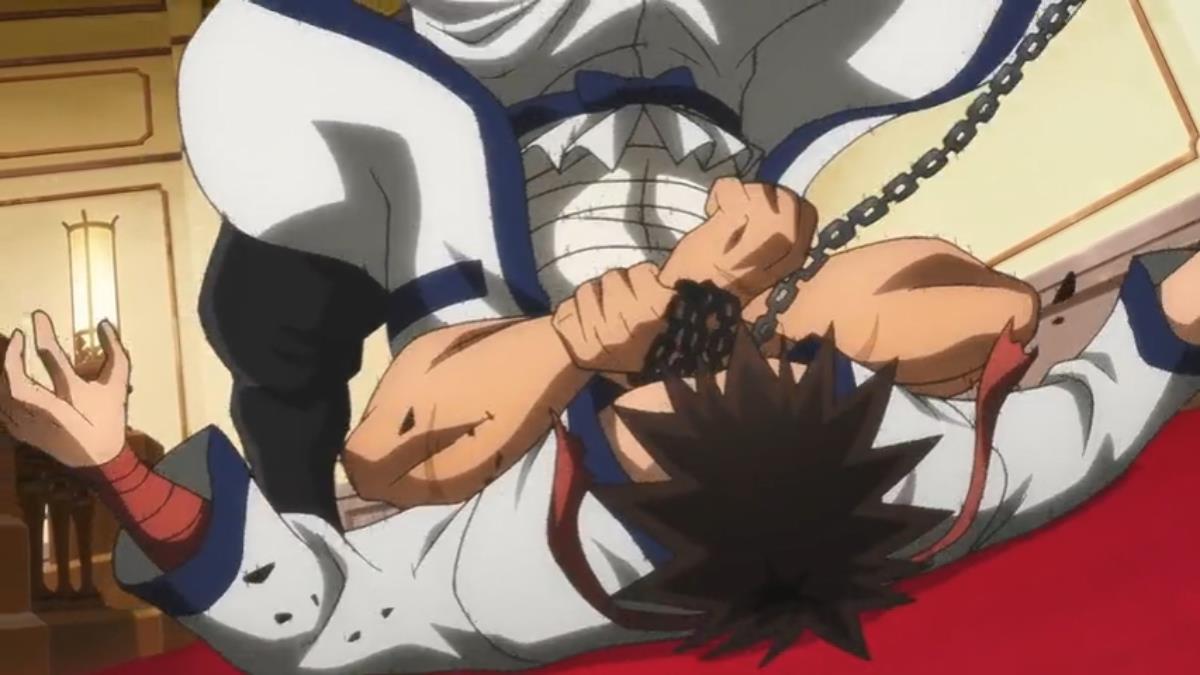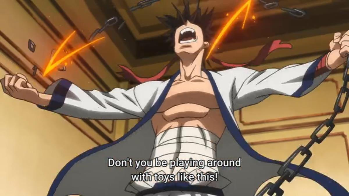 Unfortunately, Sanosuke didn’t break the chain like he did back in 1996, so Shikijo uses it to trap his arm to deal tremendous strikes. Sanosuke does eventually break the chain, but it is later than before. It would have saved him some time and pain if he had better timing.