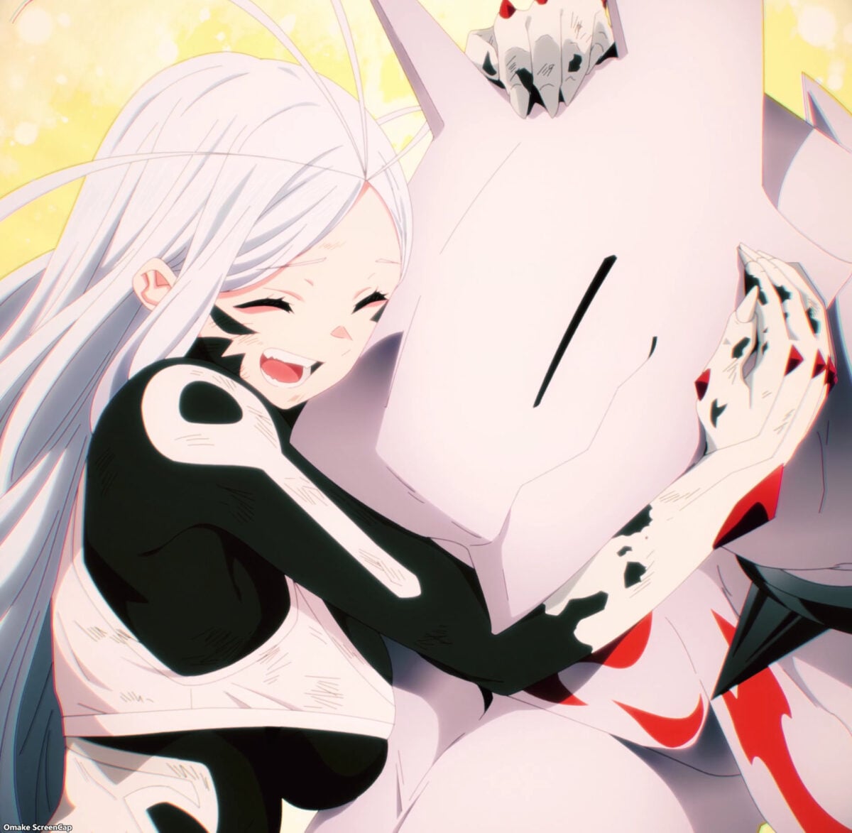 The 7th Squadron will support the 6th Squadron in search and rescue and enemy repulsion operations. Shushu still puts her jeep-driving skills to constructive use. Even a giant girl needs a wingman — Kyouka and Yuuki to the rescue! Oh, look. Chained Soldier S2 reviews the 6th Squadron’s members and abilities, too. And Yuuki reminds us of what he has at stake: his humanoid Shuuki sister, Aoba.