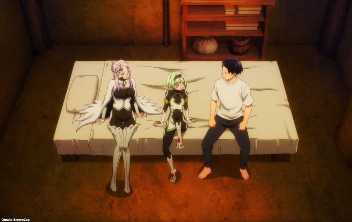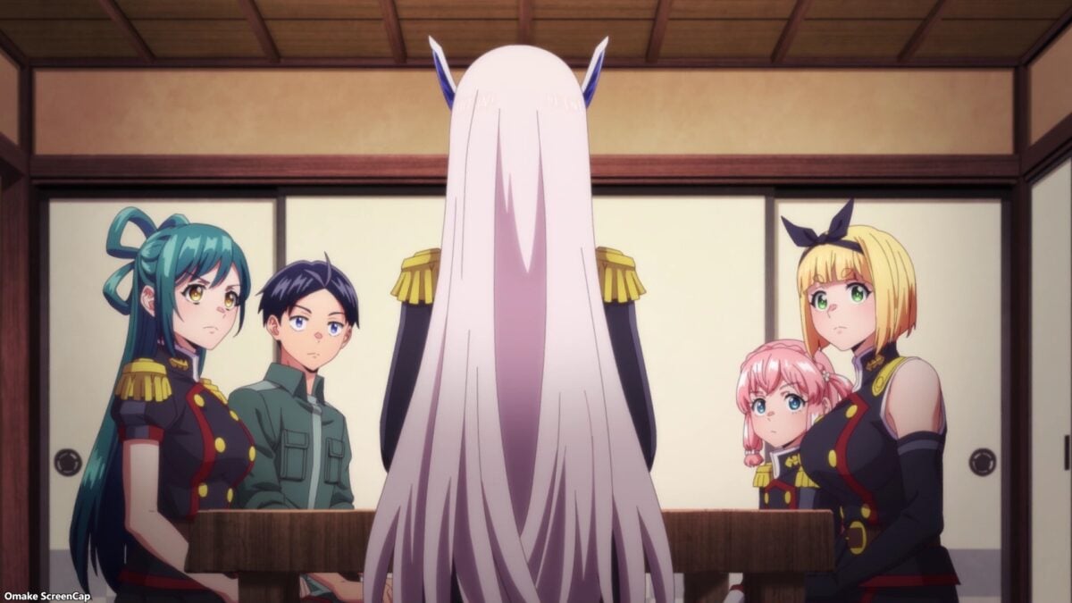 Next on the epilogue agenda — Aoba and her humanoid Shuuki friends. “Sister-in-law” Tenka is Yuuki’s direct link to his sister. Aoba needed to recharge her “little brother” battery. Tenka and Aoba confirmed that Tenka portaled Aoba to Yokohama after she learned that Kuusetsu could phase through matter. Tenka has also been supplying Aoba’s sanctuary for humanoid Shuuki girls. Yuuki’s sister worries about the Demon Defense Forces still hunting them down. However, Tenka says they’re busy with the Thunder Gods.