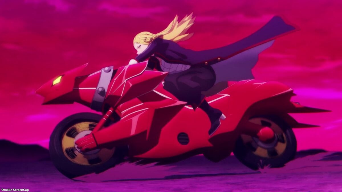 Yuuki’s motorcycle form suits Mira’s need for speed, and he can ram through a Shuuki horde. Does he have missiles or other weapons? Oh? Yuuki hints at his reward: a romantic road trip date. Mira is already riding him, so will she ride him again later in the Chained Soldier episode? Bakuon (爆音, ばくおん) means “roar of a machine,” so Yuuki inflicts a sound debuff on enemies. Unsurprising. Mira did the motorcycle maneuver, nodding to Akira. Oho! Yuuki also has a flamethrower in his mouth.