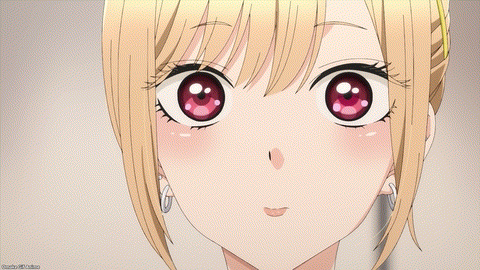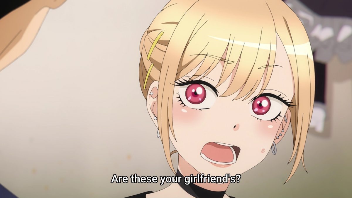 Well, since the dress is right there, let’s try it on! Yes. Yes! Gojou knows how to handle long hair. He’s the perfect Instagram boyfriend! He even has false eyelashes for her. My Dress-Up Darling shows how to use makeup tutorials for your real-life doll. There’s the episode title! Is Marin his Gyaru Hina Doll? Aw. Gojou genuinely smiled for Marin. Pew, pew, pew heartfelt! That’s the moment Marin fell in love with her dollmaker. Whoa. Marin is fearless. Bye, bye eyebrows! Gojou knows how to apply makeup as if he’s painting a Hina Doll’s face.