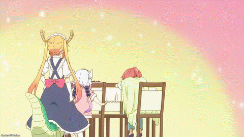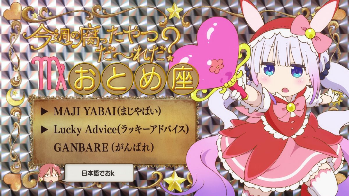 Next time, Tohru’s father, the Emperor of Demise, Damocles himself, visits… Kobayashi’s office? Will we learn where the sword that Kobayashi pulled out of Tohru came from? And what happened to that thing afterward? Kanna takes her second turn in the horoscope end cards as Virgo. Maji Yabai!