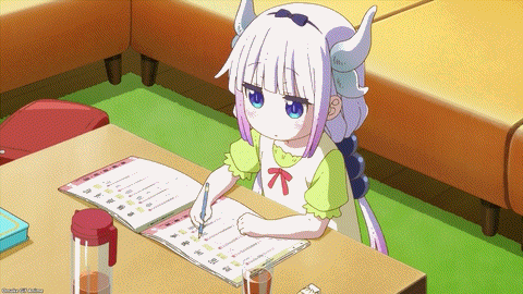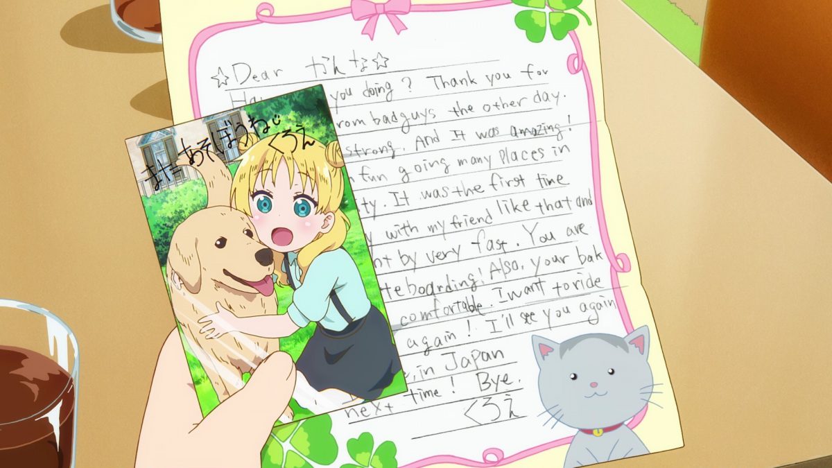 Part two for Dragon Maid gives us a lazy day summer vacation for Kanna and Kobayashi. So rare! KyoAni shows off with cold tea pouring into a drinking glass. Kanna is a diligent child: she’s doing her summer homework! Gasp! I gasped over spilled tea on a workbook… Gang members threatened a young child with breaking her arm just minutes ago, but I am worried more about wet homework. Kanna goes for the hairdryer. She plugged it into her tail! Kobayashi has more experience here. Fun! Chloe wrote Kanna a letter!