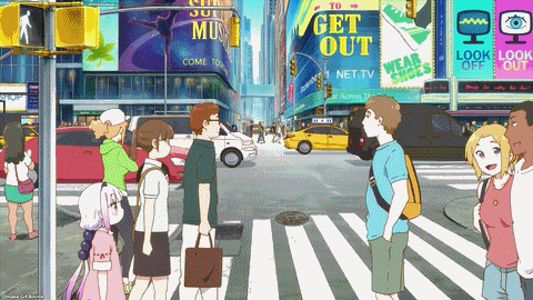 Kanna visits Times Square. Wait one second… I won’t spoil it. There’s a joke building here. Ah. How will Kanna handle money and the language barrier? Hot dog guy has a squirrely Aussie accent. The other American voices have terrible Japanese accents. Dragons are amazing! Kanna learned English! Too bad we can’t hear what her terrible American accent would sound like. I’m mildly curious to see how the dubbed Dragon Maid episode handles this episode, but not that curious. The language situation sorted itself, but the yen problem didn’t.