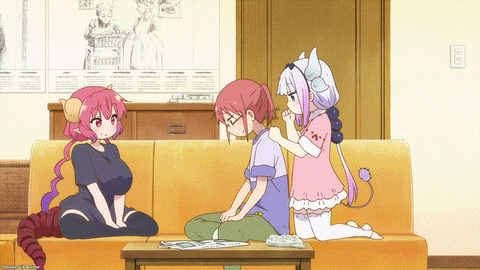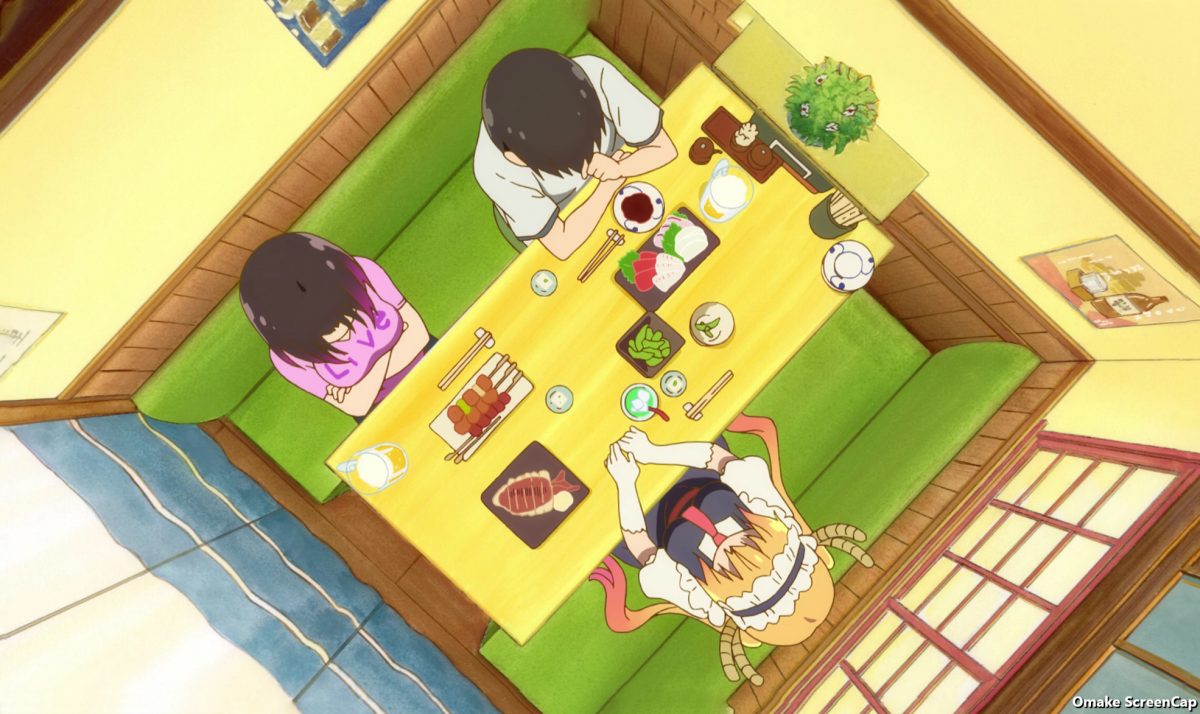 Uh oh. Kobayashi needs a back massage. No tail meat, please! Kobayashi likes gadgets. That fits her otaku personality. She’s a collector. Look at all the junk! Kobayashi will use them all! It’s a promise. Otherwise… tail meat! Oh yes! Look at that callback joke to Dragon Maid’s second episode. Ilulu could use her flame sacs for warming, right? Ooh. Kids giving parents shoulder rubs are conventional scenes in anime. Kanna has no flame sacs getting in the way. Interesting! Kobayashi expected Tohru to react childishly about joining the fun, but Tohru asked a remarkably adult question. How can she help Kobayashi without pushing her opinions on her? And a roast tail joke!