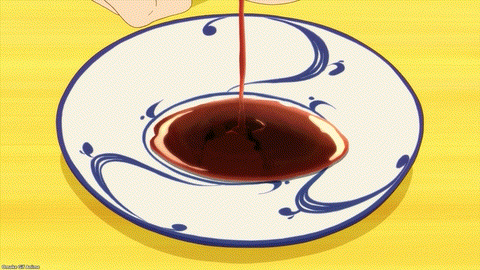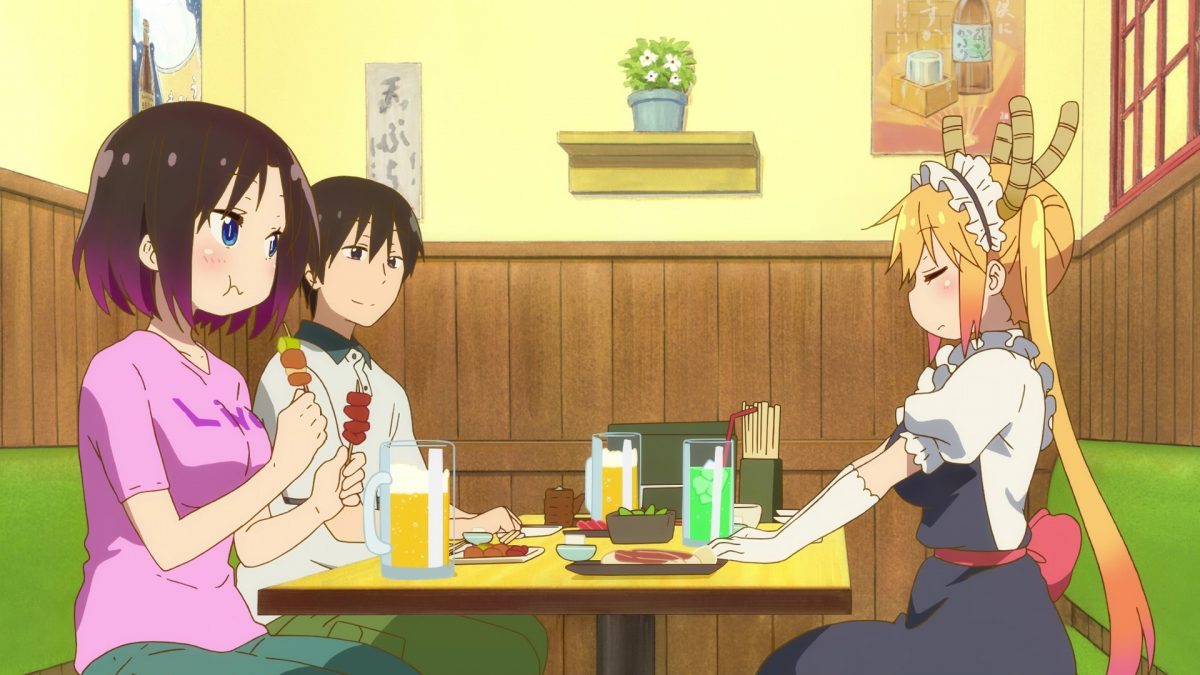 Scene change for Dragon Maid. Is the Drunken Dragon’s Den where Takiya and Kobayashi usually go after work? How rare is it to see this combination of dragons and one human? Takiya and Elma drink beer, but Tohru drinks melon soda. Elma mentions that Kobayashi’s poor posture at work contributes to her lower back pain. Occupational hazard for programmers. This was news to Tohru! Takiya turned this conversation dramatically serious. KyoAni shows off again with soy sauce. Takiya’s point about food trapping a visitor to another world is about committing to one place or the other. Avoid straddling both worlds if you want to be loyal to your partner. Har! Tohru stuck Takiya with the check! He better end the meal before Elma starts pigging out.