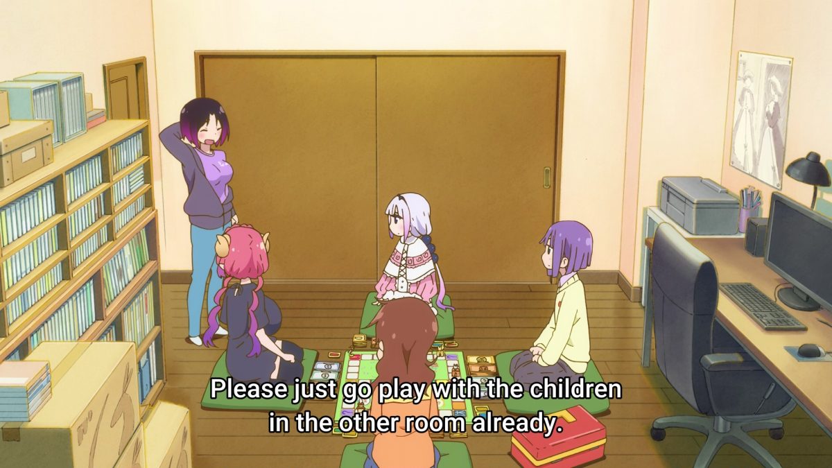 Emergency meeting! Tohru needs her friends to brainstorm a maid outfit that would look good on Kobayashi! Nice. The kids don’t involve themselves in this farce and play Monopoly instead. Shouta makes an appearance! Elma came for the snacks. She still can’t find a jacket to fit over her shoulders… Har. Georgie calls Kobayashi her “comrade.” She’s right.