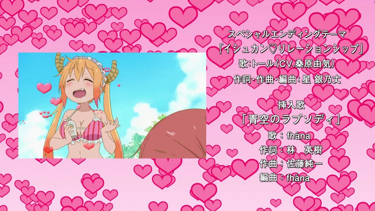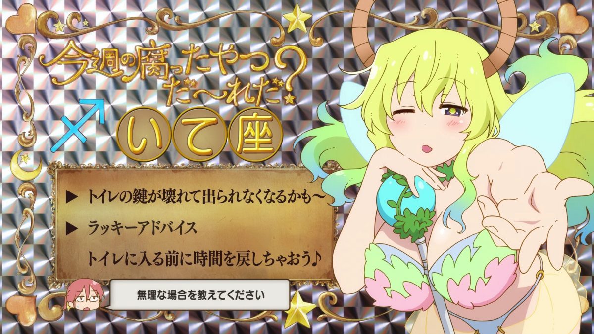 Amazing. The end credits have Tohru’s love song for Kobayashi! “Cross-species Relationship” calls back to the first season’s ending theme, “Cross-species Communication.” Love kiss, lick kiss, love Miss Kobayashi! Check out all the lovey-dovey moments from the Dragon Maid first season too. Next time, we get to spend time with Elma and her ill-fitting jackets. Lucoa’s Sagittarius tells us to mind the lock on the bathroom door in the end card.