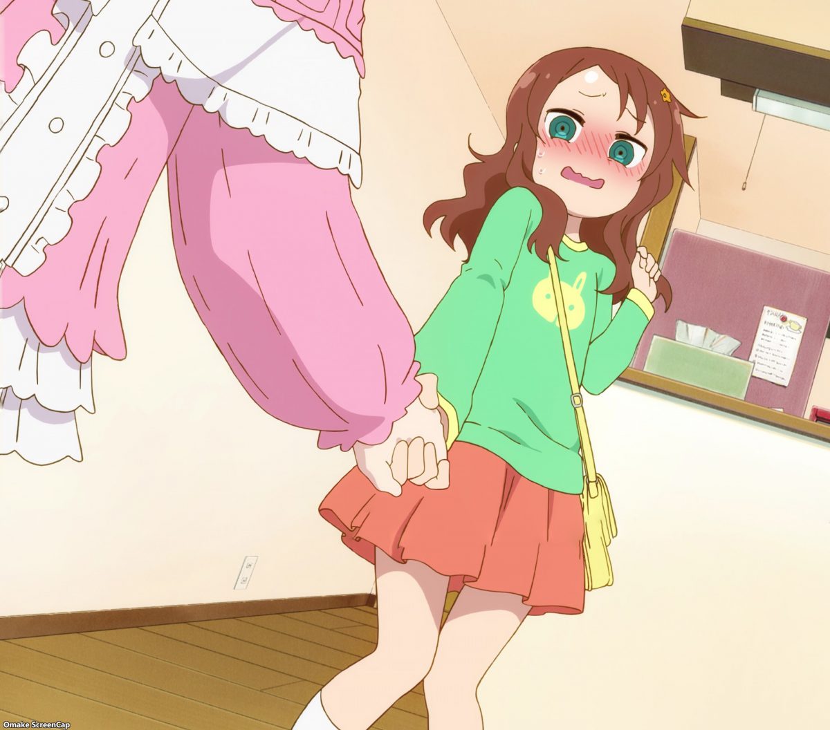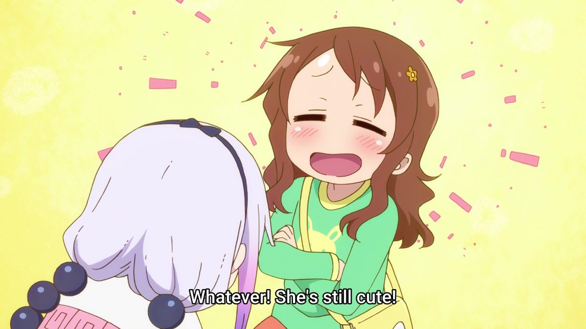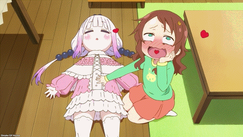 Yay! Riko Saikawa is here to play with Kanna! I love how Riko thinks of Kobayashi as Kanna’s “mom.” Hoho. Riko plots what to do with Kanna when they’re alone together. Climb the stairs to adulthood! Ah. Not so alone together. Ilulu is on the toilet. Has no one shown Ilulu how to lock the door? Kanna calls Ilulu a friend. Simple enough.