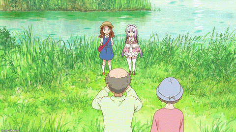 River walking montage in Dragon Maid. This is a long hike for grade-schoolers. Kanna says she loves bathing in rivers. Someone else loves bathing in rivers too! Elma forgot her perception blocking magic. That Leviathan needs to find a human partner too, or she’ll keep doing crap like this. Quick! Riko, take a picture of Loch Ness Elma! Oh well, she took a picture of Kanna, which is even better. They made it to the end. Nice. An elderly man’s story of how the river changed makes Kanna consider how she’ll change. Cute. Riko is sure she’ll grow old together with Kanna.