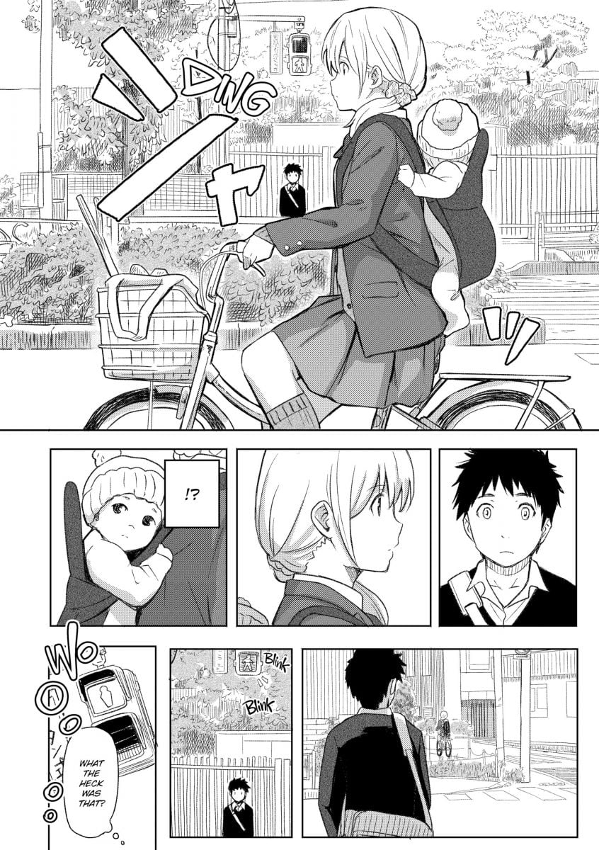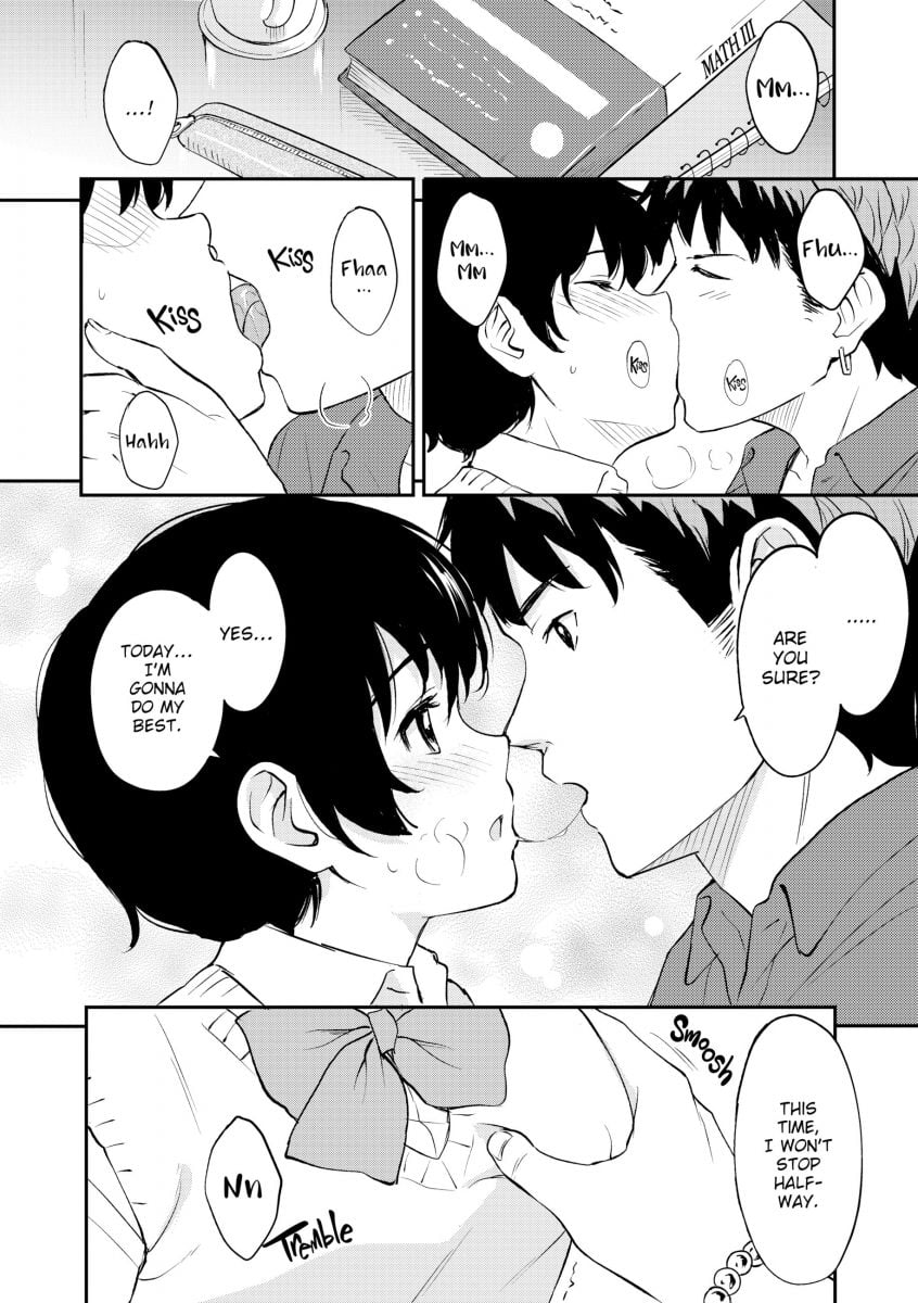Take, for example, the opening chapter Because It’s You. In this story, highschooler Ishiyama is a little concerned about his caring, blonde-haired girlfriend Tooru. Lately, whenever he asks to do something, she says she has plans and can’t. She still makes him lunch every day, but he can’t help but wonder what’s keeping her so busy. As he leaves school alone, he spots her riding her bike somewhere…with a baby attached to her back. Confused, he decides to ask her about the baby the next day, and she embarrassingly reveals that her parents decided to have another kid out of the blue, leaving her to be in charge of babysitting since her mom works evenings. Tooru wants Ishiyama to forget about it, and not tell anyone about the baby. Instead, he asks to come over to her house to help watch the child. While they’re there, Tooru can’t help but be happy by how well her boyfriend is handling the baby situation, and her love for him sparks even brighter, leading to the two having some intimate fun as their feelings rush over them.