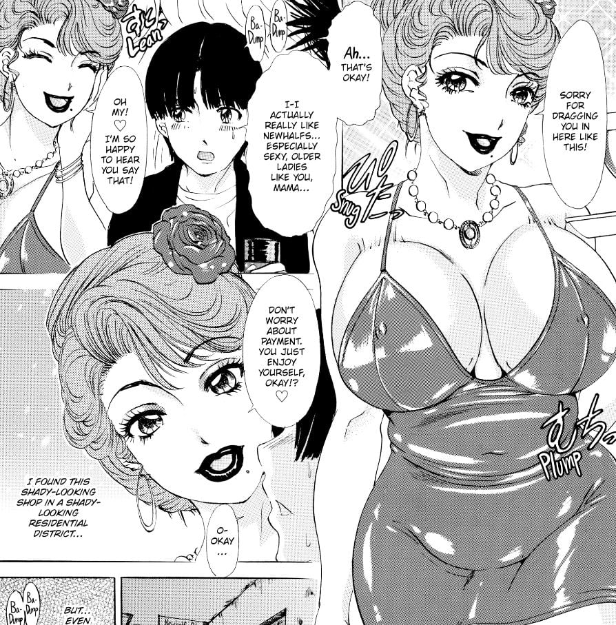 Meanwhile, in Mama’s Milk, a young man is bored and decides to wander through a shady-looking residential district. He happens upon an equally shady looking bar named Banana Mama that promises sexy newhalfs inside. He’s got a thing for them, so when a buxom mama hostess comes outside and urges him to come inside, he happily obliges. He’s immediately thrown for a loop when he sees all of the mamas walking around with their private parts dangling free. The older hostess who dragged him into the bar has a thing for younger boys, and immediately begins teasing him. What starts as simple teasing, though, quickly escalates into full-blown sex in the middle of a bar full of buxom shemales.