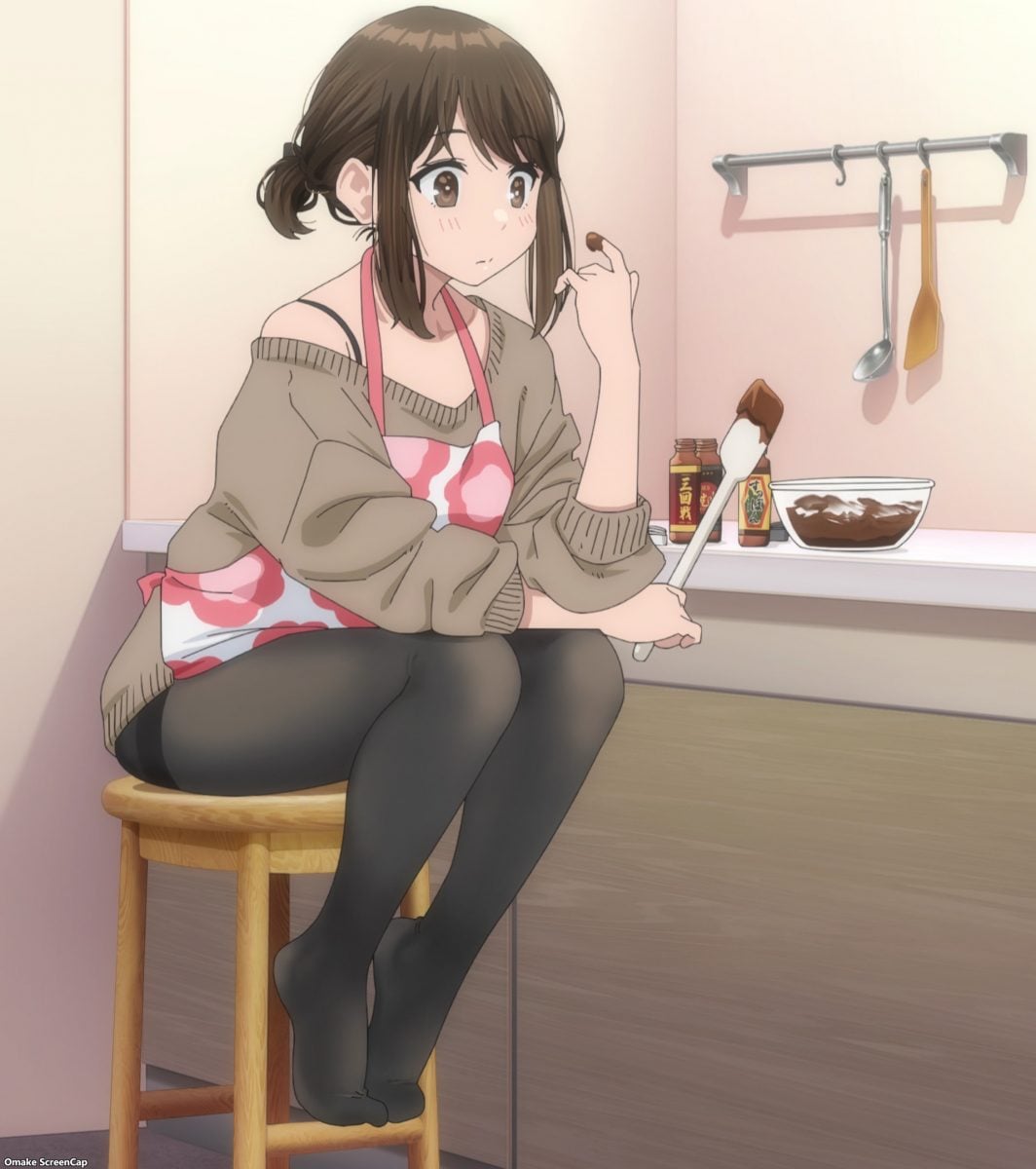 As a fan of Yom’s work with hosiery and sexy legs, I had hoped we would see more scenes than what Ganbare Doukichan has shown us so far. Granted, Doukichan is the only woman we’ve spent time with, and I appreciated so much her scene making chocolate at the end. Also, Yom’s earlier anime adaption, Miru Tights, spoiled us with legs and pantyhose. The show’s name explicitly directed our attention to the subject matter, and sexy tights inundated us from many sources in the first moments. Ganbare Doukichan is more about building relationships, so it’s taking its time to introduce its characters. Thankfully, Kouhaichan made a splash with her entrance. We should look forward to seeing how well her shapely tights-covered legs match her well-defined cleavage.