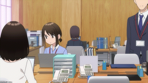 Oh, no. Doukichan is one of those girls who wants to create a special moment to give her Valentine’s Day chocolate to Doukikun. Did that ever work for her in junior high? High school? College? If not, how could it work in an office setting? Ha! Kouhaichan, the open, flirty, and friendly coworker, knows how to make a scene. Doukichan’s despair face is meme-worthy.