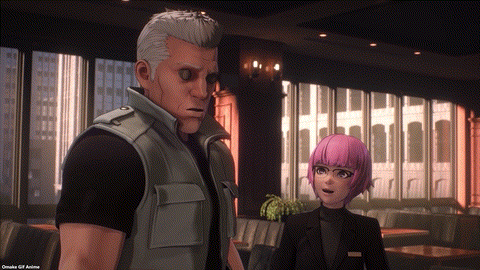 This is not credible. How could Kukushkin be alone at a bar without a security escort? Anyway, time for SAC_2045 to show an assassination attempt. What a coincidence! Another Russian happens to appear and share a drink with grumpy Kukushkin. Check for radioactive poison, my guy. Too late! Hahaha! Polonium! That’s so obvious it’s like framing the Russians. Motoko doesn’t buy it either. Uh oh! Kukushkin’s head didn’t have a cyber brain in it! Ooh. Motoko partnered Purin with Batou. Look at how Purin squees! She can brag to the Tachikomas later.