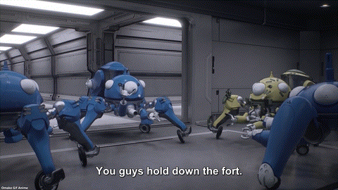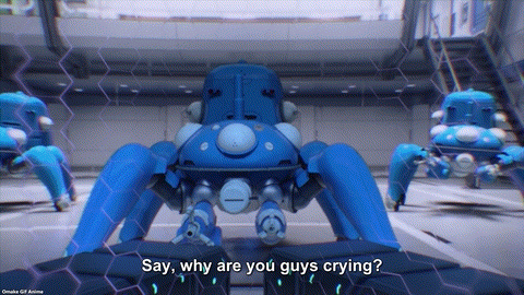 Yup! Purin’s freezer was full of hard drives. For SAC_2045, the real Purin Esaki was in there. Would a post-human need external storage? Oh, poor girl. She has the memory of finding her dead family recorded! The one who watched over her in the hospital was Batou! He gave her a pudding cup. That’s how she chose her new name! Pudding is purin (プリン) in Japanese. Her goal had been to work with Batou ever since. The end credits also reference this scene. Aw. The Tachikomas started to cry!