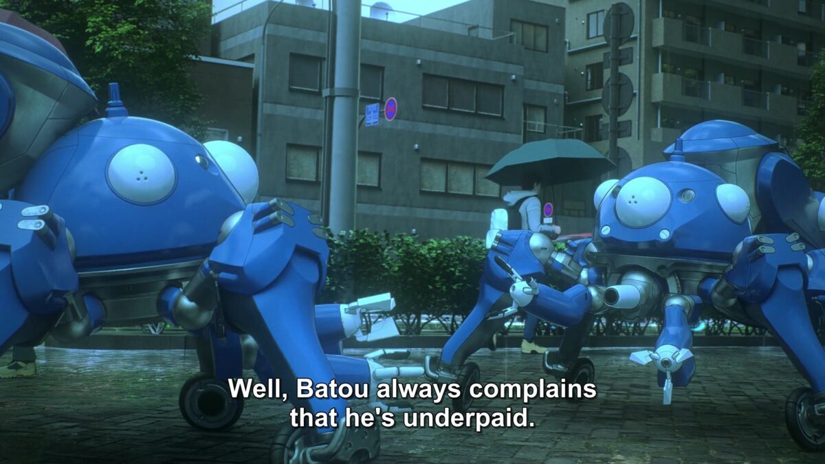 The Tachikomas’ decision proves that Artificial Intelligence is different than Human Intelligence. Purin’s conversation with 1A84 showed its inflexibility to its preset programming. The Tachikomas have distinct priorities, senses of personal space, and morality from the human characters in SAC_2045. Motoko gave them implicit permission to investigate Purin, but they didn’t know she was watching. They also decided on their own to reboot Purin from a backup. Section 9 didn’t know about that. For Tachikomas, data is life. They’re not dead unless their data become corrupted or erased. A human would have paused a moment before resurrecting Purin from her memory backups. Would her personality change? Were there gaps in her record timeline? Those questions of morality didn’t pop up for the Tachikomas. Purin was one of them. She needed to come back!