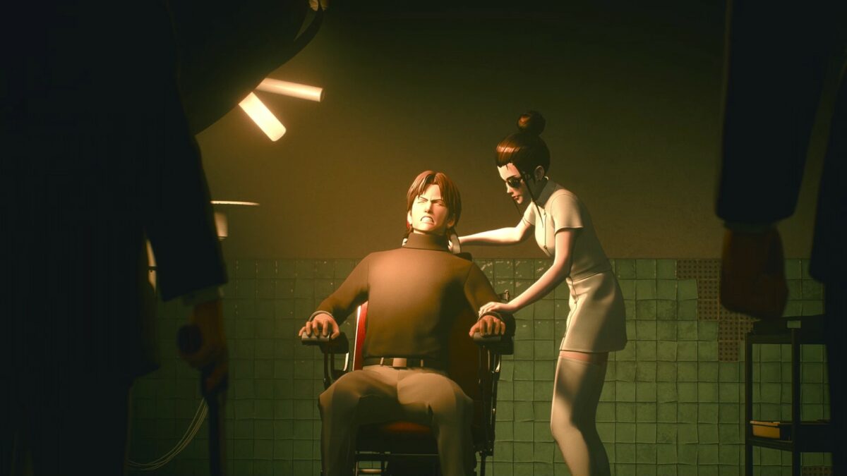 Ooh, hurt me, Nurse Suzuka! Eh, Togusa believes he’s watching memories from sixteen years ago. Uh, doubt it! Suzuka Mizukane did not torture Togusa back then in Ghost in the Shell. She was a mathematician before 1A84’s meme code turned her into a post-human. Nothing here matters until Togusa escapes. Wait. Nurse Suzuka’s zettai ryouiki (絶対領域, lit. “absolute zone,” the exposed skin between the top of knee-high socks and the hemline of a skirt) matters. Will she return to Togusa’s delusions? Oh please, oh please, oh please.