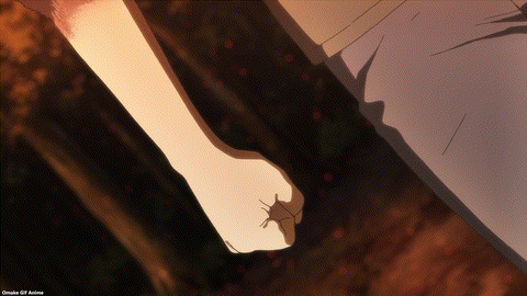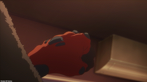 Nice sound editing to go with Shuuichi picking up a scent. I heard a wolf howl. He can smell death. The hot blonde girl from the opening credits has problems too. And panty flash. This is going to happen a lot in Gleipnir, isn’t it? Nana’s mom was happy about her getting a college recommendation. Will there be a lot of dog imagery in Gleipnir too? Aw. Shuuichi buried the dead raccoon dog. He cares about things.