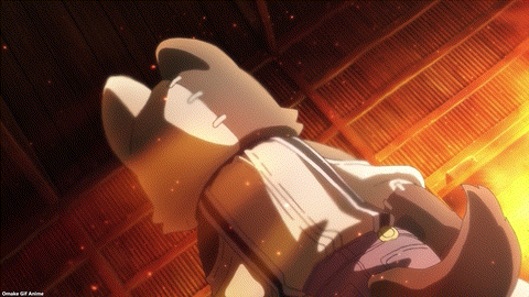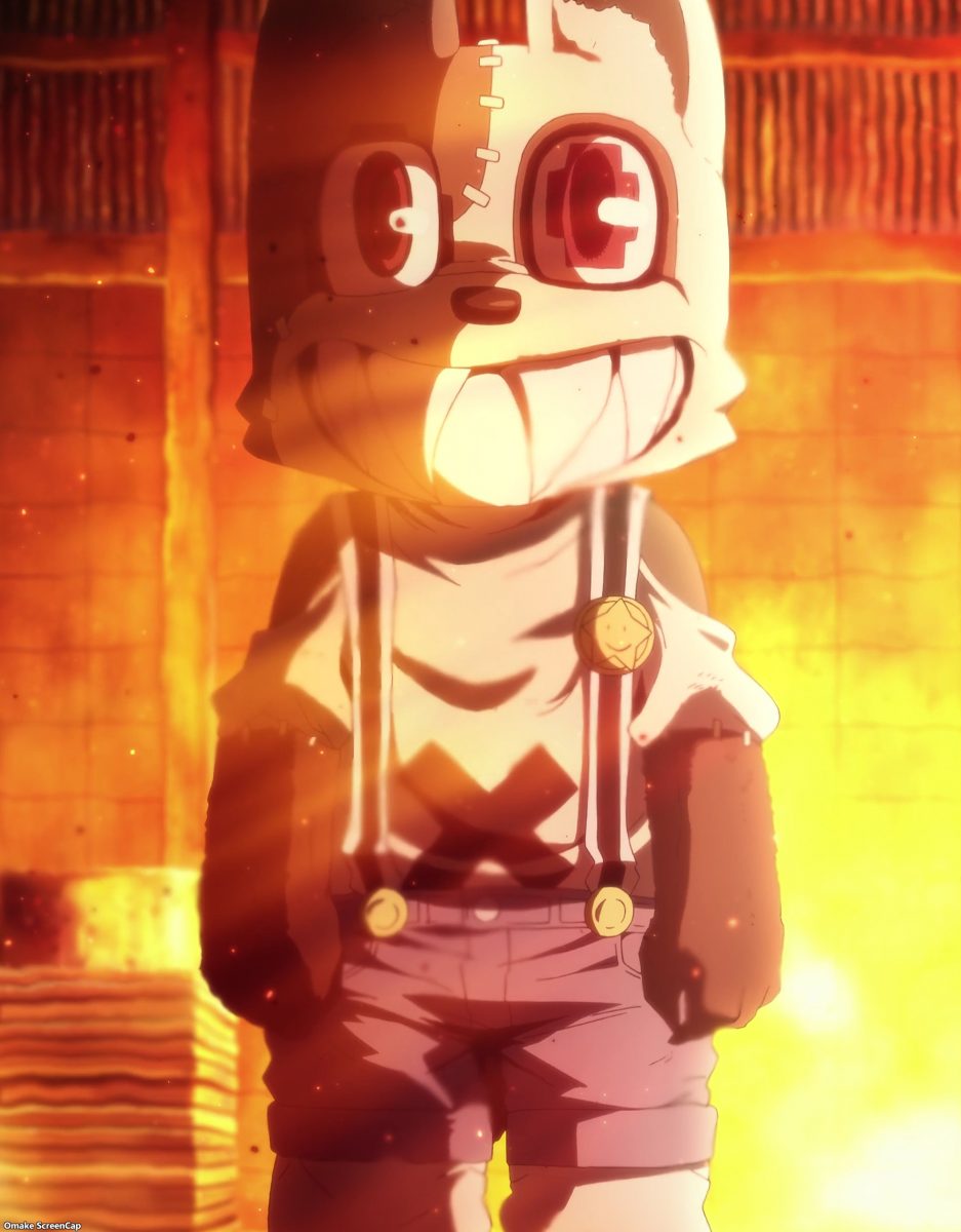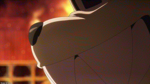 Uh oh. That hot girl is showing her bra and is in hot trouble! Ha! Shuuichi actually said, “there’s a beast inside me!” He’s a little old for the horror-puberty allegory. Maybe he’s a late bloomer. Hurry up, man! You’ve got to save those wonderful breasts from burning! Wow. He really does look like a yuru-chara version of a Frankenstein’s Wolf. Shuuichi thinks it’s a dog, but with an anime title like Gleipnir, that’s got to be Fenrir the mythical wolf. He moves around like he’s in a mascot costume. He’s no overgrown plushie. He smashed through a brick wall!