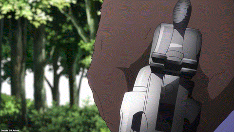 There were a couple of things I wish were clearer. First, did Madoka the Gorilla Guy take the bullet shot from Shuuichi’s gun, or did he just move to reposition the gun’s aim quicker than Clair and Shuuichi expected? In the last Gleipnir episode, we saw Gorilla Guy’s face steaming after he took Youta’s punch, but we saw no such aftermath scene besides Shuuichi’s smoking gun.