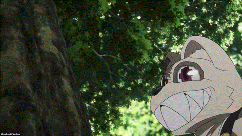 Beast man talks! Aw. He’s a cute kid named Isao who likes plants. I have no idea how that translates into a yeti-looking thing with floppy ears. Oh, come on, Clair. Don’t glare at Isao too. Maybe Clair just has a “resting bitch face.” He’s adorable. He grew flowers to welcome Shuuichi. Not for Clair, I notice. Gleipnir supplied a nice scene for showing how alien powers work. Hoh. Isao recognizes Shuuichi from the Yamada Cram School. This is good. Slowly introducing Shuuichi’s swiss cheese memory of his time there. Shuuichi claims he was the only student at the cram school! Mysterious! Both Clair and Chihiro don’t like the sound of that.
