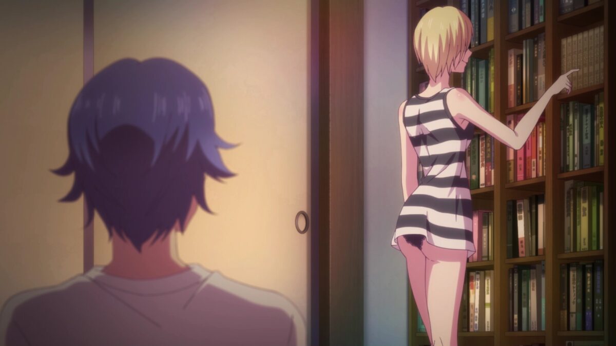 Gah! Hayato still talks out loud to himself. Will he never learn that’s the source of all his problems in Goddess Café Terrace? See? Akane overheard him. She brings iced coffee to Hayato on a hot night. Are things about to get hotter? Akane noticed Hayato’s big, uh, collection of books. Hoo! Short skirts and low desks don’t mix well for decency. Akane’s finger rests on Hayato’s volumes of Natsume Souseki’s works, the alleged most invincible character in Bungo Stray Dogs!