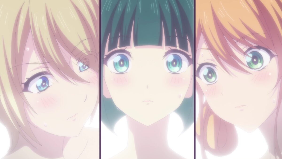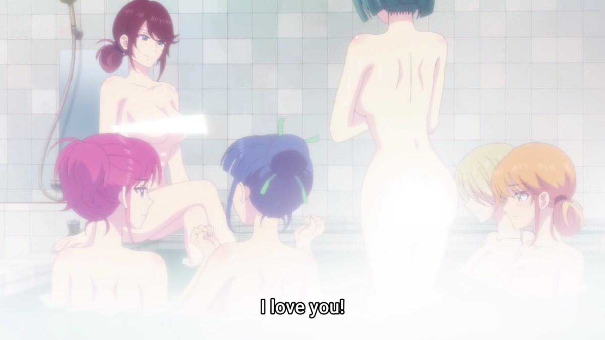 Look! The order of the girls succumbing to the heat of the bath tracks with how open they are about their feelings for Hayato. Shiragiku gave up first, then Riho. Akane can handle her burning love’s heat for Hayato! Riho is on the same page about postponing love until after the Familia Café Terrace is a healthy business. But the heart isn’t a rational muscle. Oh! Akane openly declared a love battle! Bare skin makes girls bare everything!