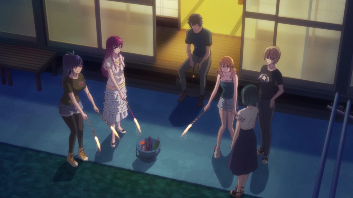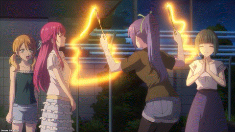 Backyard fireworks for Goddess Café Terrace. Does that mean there is no summer festival fireworks show? Hayato feels nostalgic because fireworks had always signaled that summer was close to over. Poop! Double poop! Summer can’t be over already! Oho. Akane liked that soft smile on Hayato’s face. Did that spark another set of fireworks for night maneuvers?