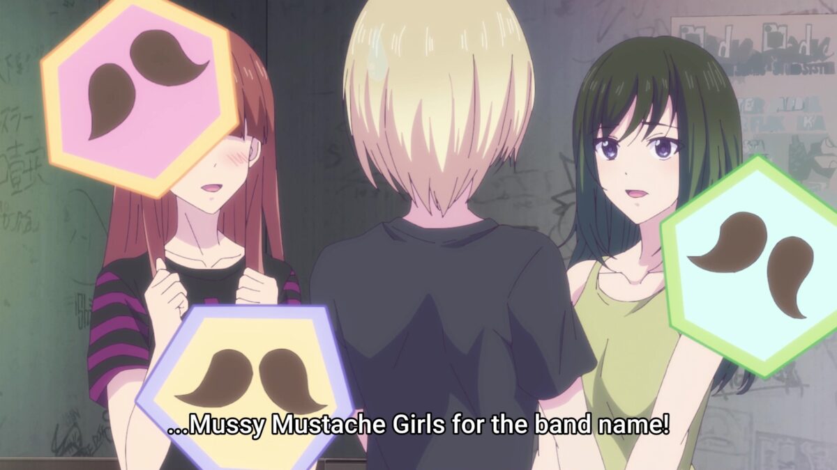 Akane and Shiragiku also scored Baka Charm points. Akane’s obsession with Mussy Mustache Girls for a tongue-twister convinced her bandmates to adopt the name. And Shiragiku’s ongoing oblivious amnesia from her blackout-drunk antics proves she has a silly side.