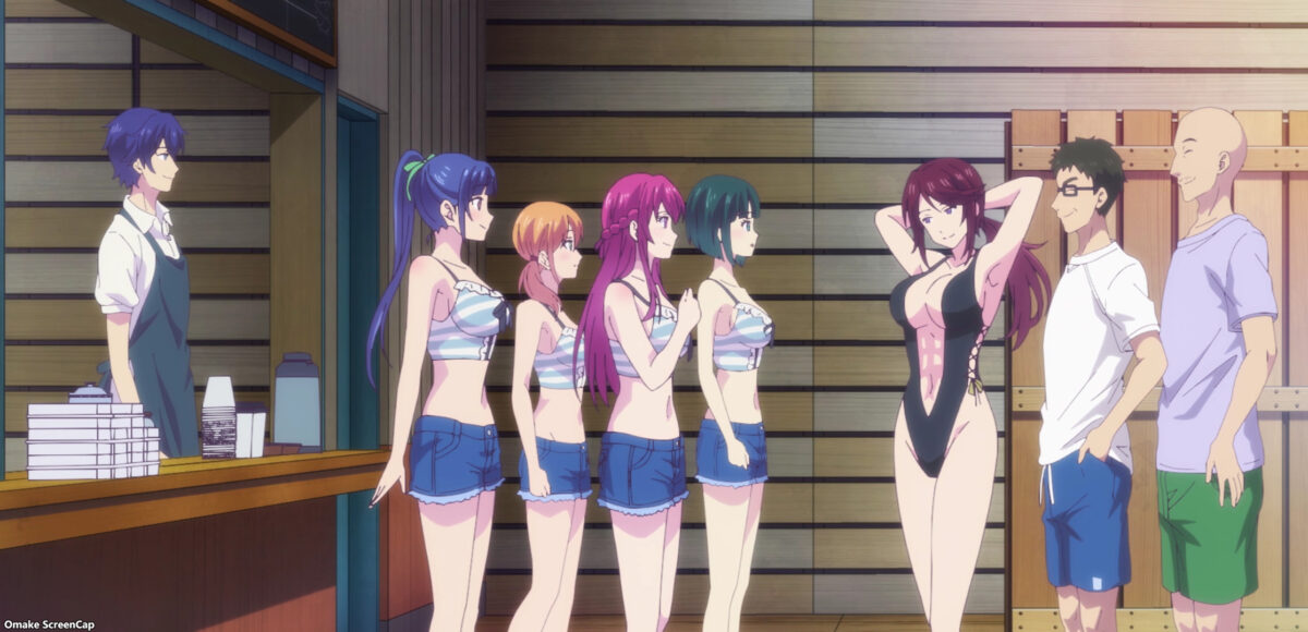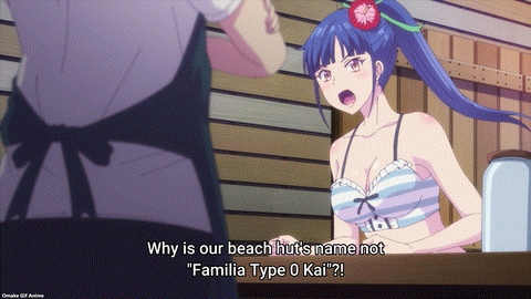 Beach Hut Time for Goddess Café Terrace! Seaside Café Familia? Looks fancy. Fun. Ouka took Hayato and Shiragiku’s advice for the official beach hut waitress uniforms. Only one hibiscus for the hairband, so Shiragiku had better stop getting drunk from liquor fumes. And a bustier style tank top to guard Shiragiku’s modesty. Aw, and hahaha! Ami wanted “Familia Type 0 Kai” on the sign! Typical. The army blamed the navy. Funny! Ami keeps the recurring joke of asking about Ami’s drunkenness alive. Guh! Acchan from the market district is a top-tier MILF! Look at those abs! Ami likes them too! Acchan makes traditional Japanese sweets called wagashi (和菓子), but that swimsuit is untraditional. Not traditional at all.