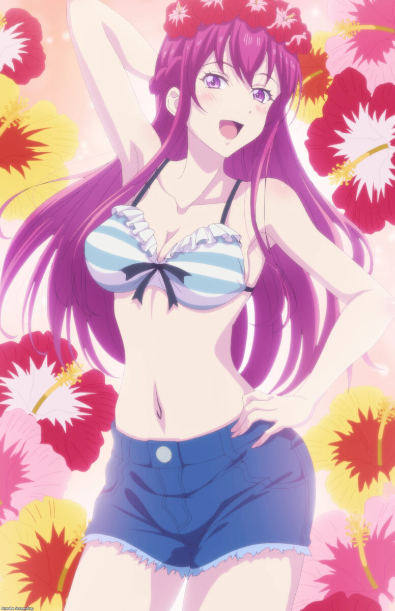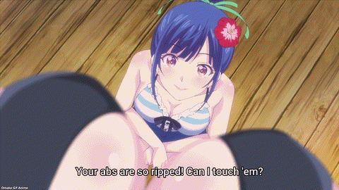 Whoa! Ouka fabricated a bikini-type uniform prototype! Powder blue stripes match the regular uniforms, but horizontal ones on swimsuits call to the hearts of cultured individuals everywhere. Goddess Café Terrace knows its audience. I’ll wager that the hibiscus flower hairband will end up around Shiragiku’s boobs soon. Hoho. Ouka found one of Hayato’s weak points: he’s shy around sexually assertive girls. Good luck, Drunk Shiragiku! Uh oh. Riho pouts. Why? Ah, I see. She competes for Hayato’s attention. Bikini babe, Riho!