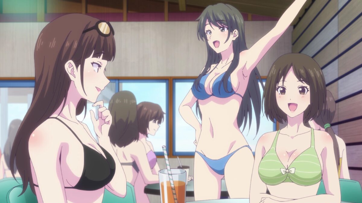 Riho adjusted quickly and recruited herself, Shiragiku, and Ouka by suggesting a “grammable (Instagram-worthy)” summer menu served by waitresses in cute beach hut outfits. Ami asked the most pertinent chuunibyou question: what’s the name of the beach hut? Familia Type 0 Kai! Vetoed, of course, over Ami’s effusive approval.