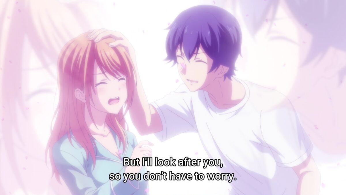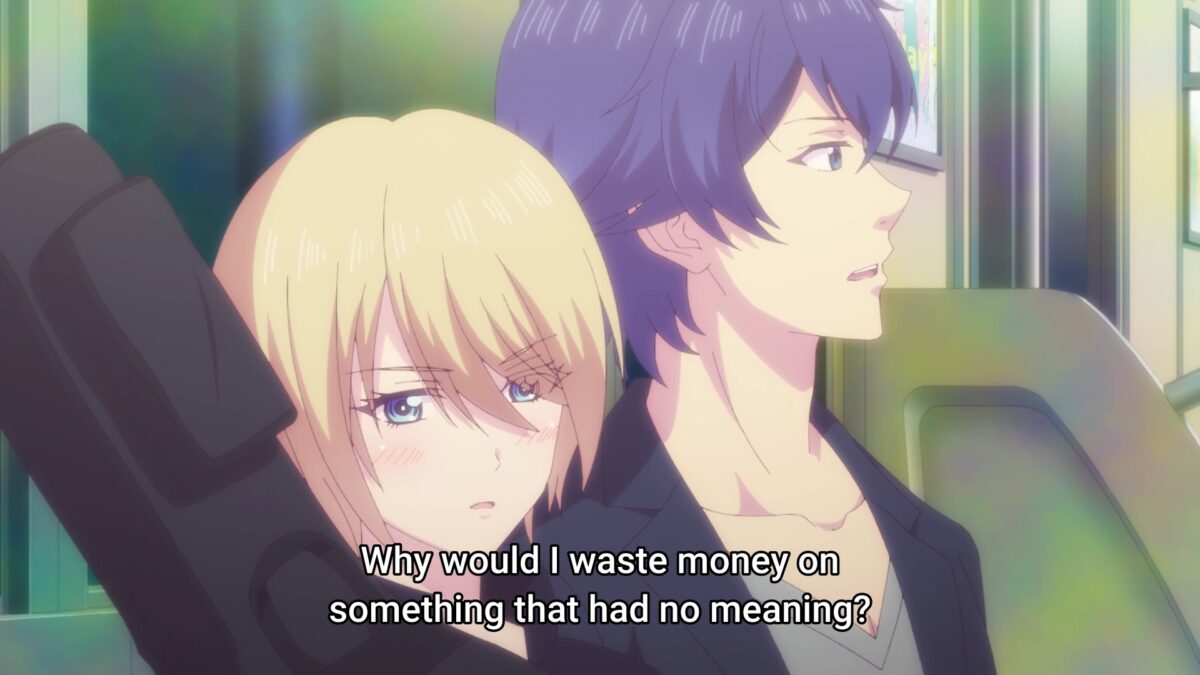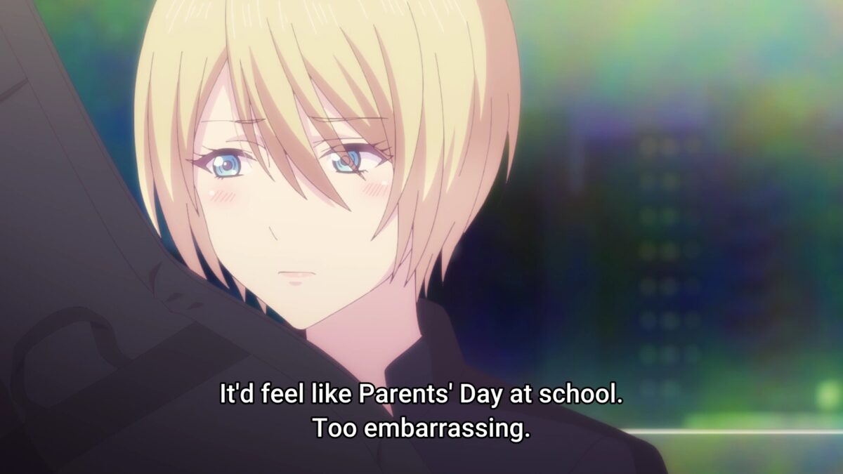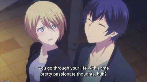 Hayato’s pat on Riho’s buttered bread was still fresh in my mind when he also promised to care for Akane until her music career paid off. That was supposed to raise a harem flag, but it flipped up an NTR flag instead. Hayato told one girl not to worry and promised to be the sugar daddy for an aspiring musical artist. Ahem. I’ll give Goddess Café Terrace the more charitable interpretation. Patron of the arts! Does that sound better? But can Hayato afford to financially support two women? Does he write checks he can’t cash? That doesn’t sound like the Hayato who constantly complains about money. Hayato ticks a notch on the Bathos Melodrama Meter when he doesn’t think with the correct head.