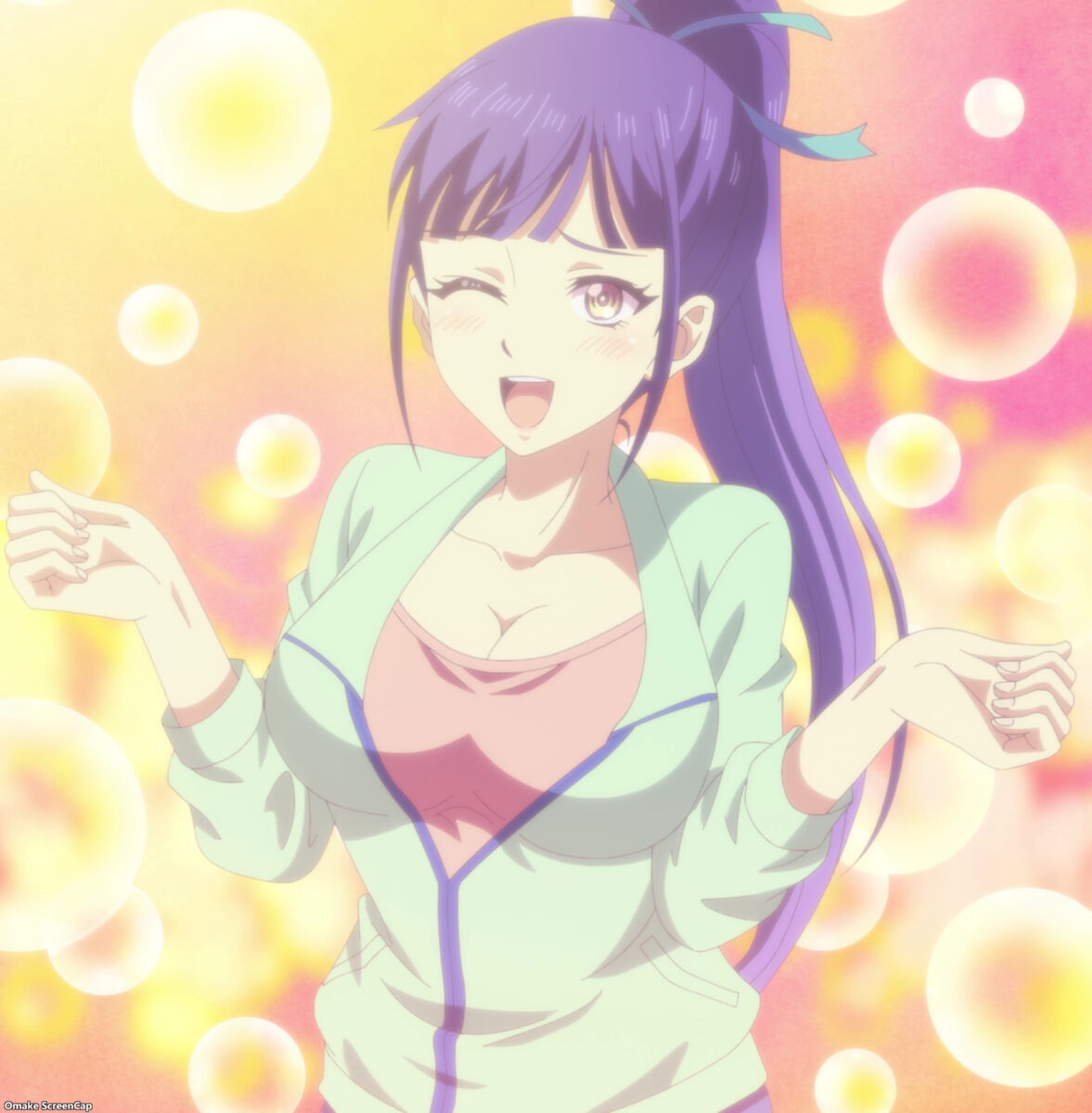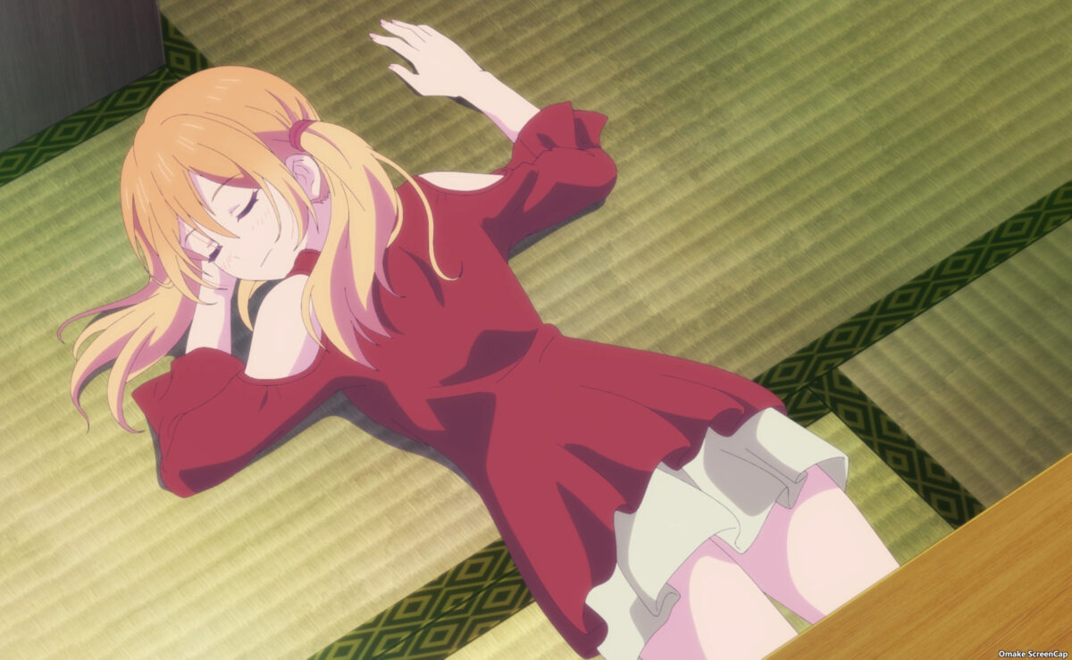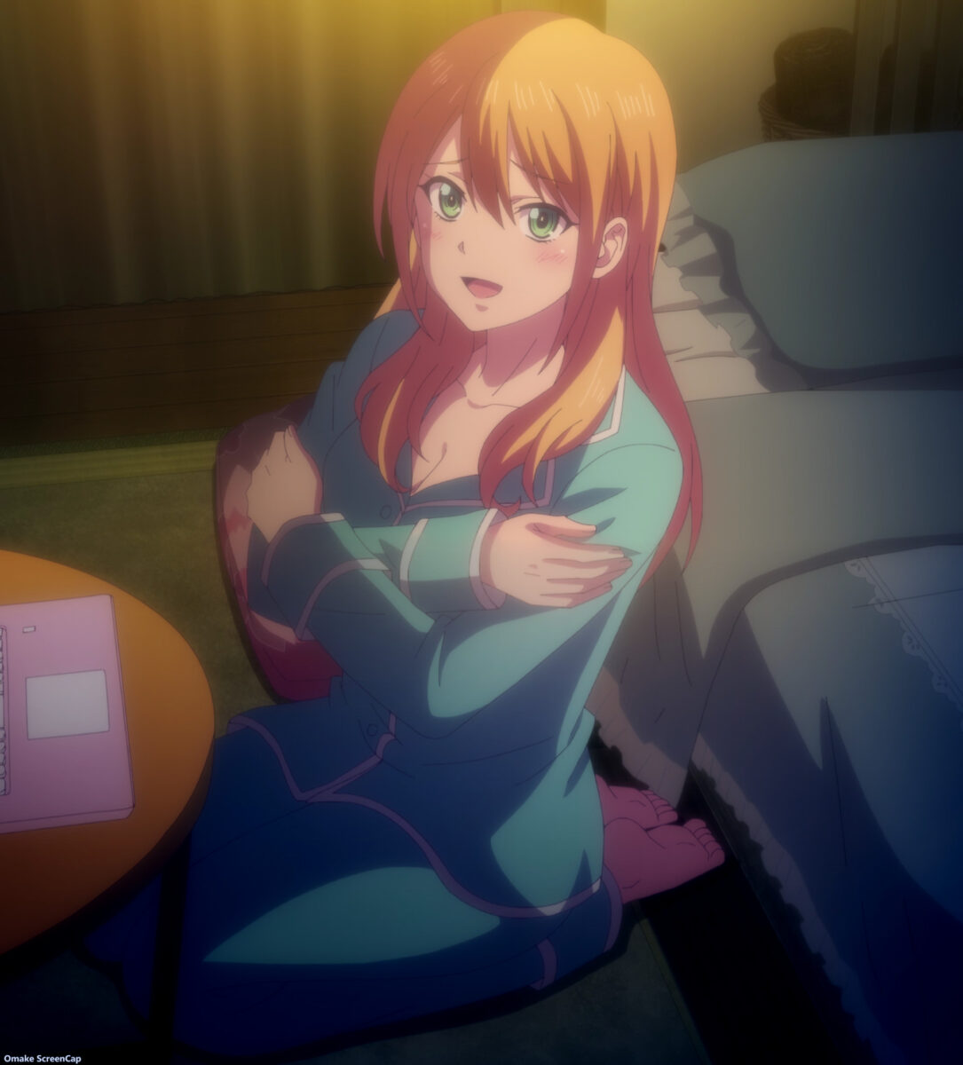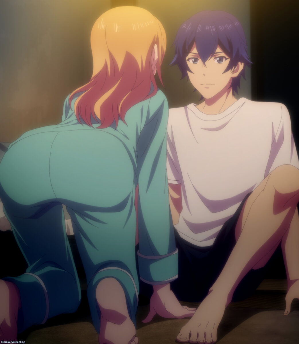 Shiragiku scored points without drinking any alcohol. All through flashbacks. Ami aided by asking her about stinky smells in a funny recurring joke. Then she made her roommates remember how she’s drunkenly thrown herself at Hayato several times. The girl-talk scene was the only source of fanservice in the Goddess Café Terrace episode, and they were all recycled! Thank goodness the preview showed more in flagrante delicto coming up.