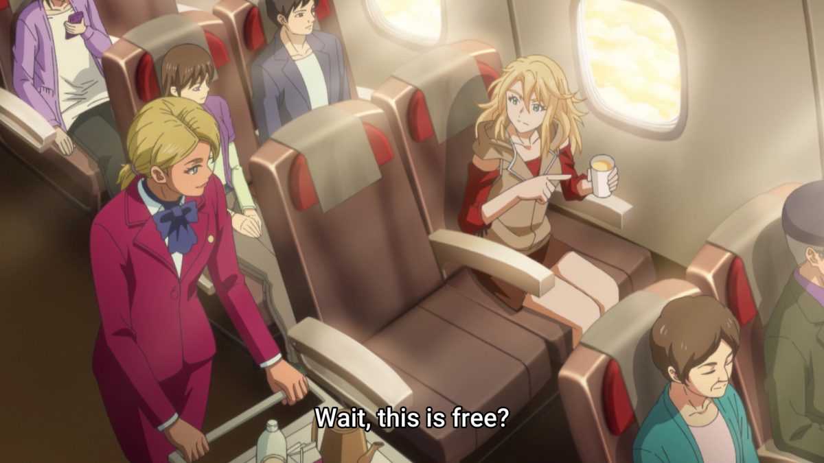 We have a long time for a BIRDIE WING epilogue. Rose is just waiting around to get killed. Ha. Hahaha! Eve got Rose back by smacking her ball and holing out. Leo shows up for some reason. So, Rose called Leo, but he didn’t want to see her. So, Leo went to Klein’s bar, talking about sentimentality. He said his goodbyes to her when she had her hand cut off, so his appearance here is a favor to her in her last moments. Leo foresees Eve raining down rainbow bullets over the world if she awakens her inner power. Only Aoi can do that! If only Rose was more ambitious, she could have led a happy golfing life with Leo. The music sounds like a Spaghetti Western at high noon. Goodbye Rose. I liked your taut belly and tight pantsuit. Meanwhile, Eve just learned about complimentary drinks on airlines. Keep them coming!