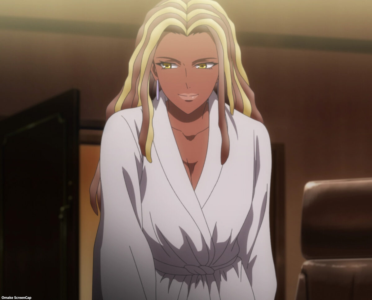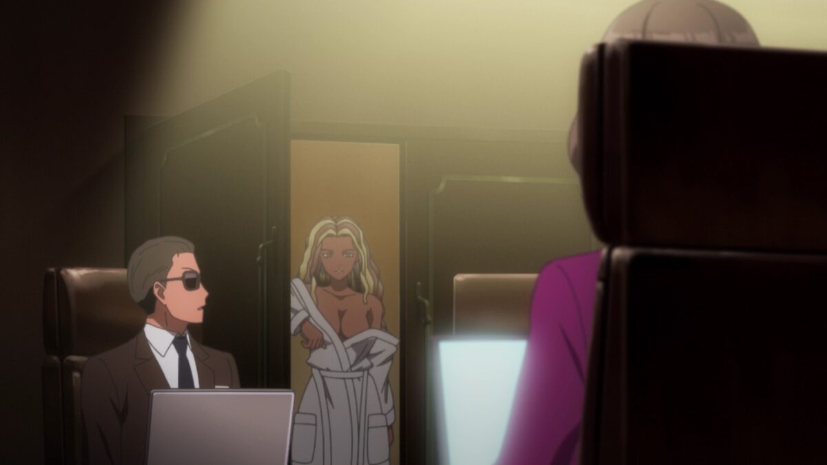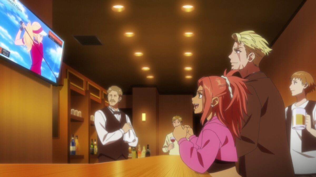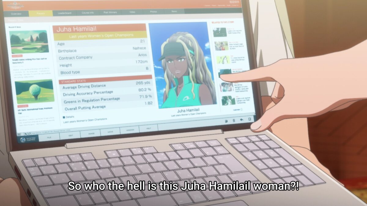 Juha has a crack team of data analysts and strategists. Those rich American pro athletes! But why do they wear sunglasses in a darkened conference room? Operating systems come with dark mode now, you know. Juha’s team predicts a winning score of -10 for the British Open and that Juha’s condition will also peak on the final day. That’s how Leo plans for Aisha’s golf tournaments. Oh, please. Juha’s caddy’s name is Karen, and she has the hairstyle! Ooh. Aoi and Eve got Juha’s attention on the tournament’s first day! Fun. Juha likes the unexpected because it makes golf fun! That’s how Aoi plays golf. What part of Eve’s golf game will show up next? Juha’s Lunar Empress golf logo is in the opening credits.